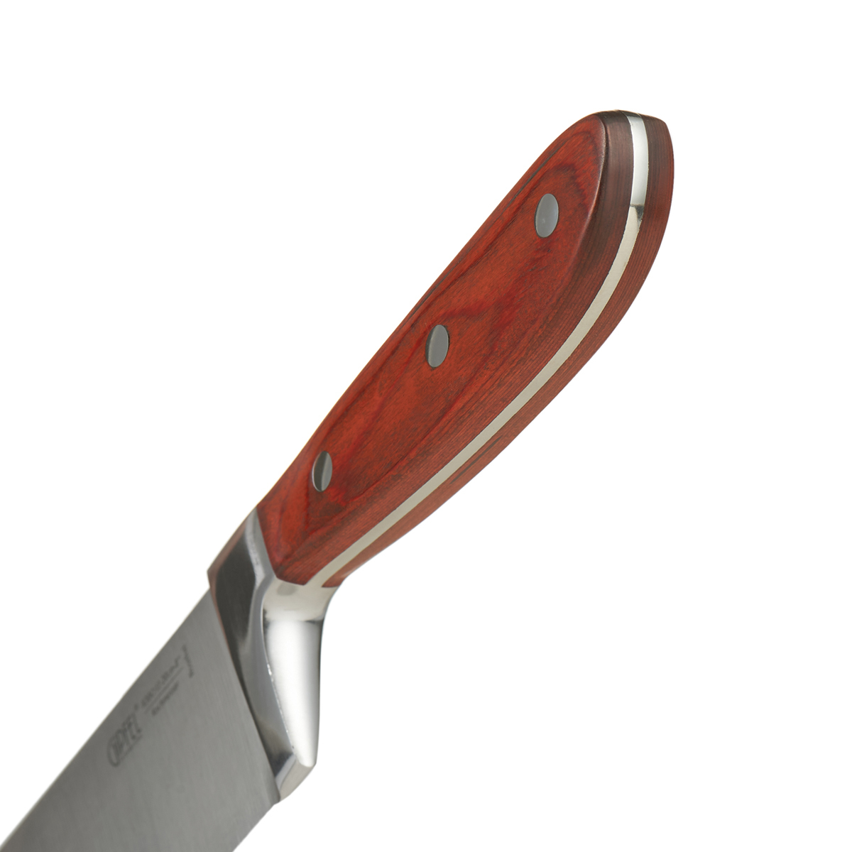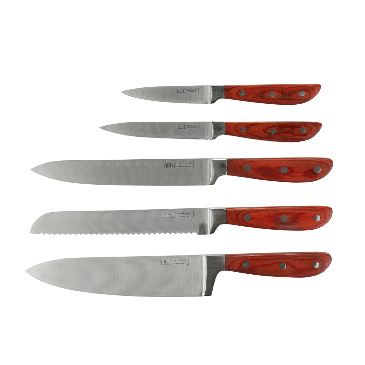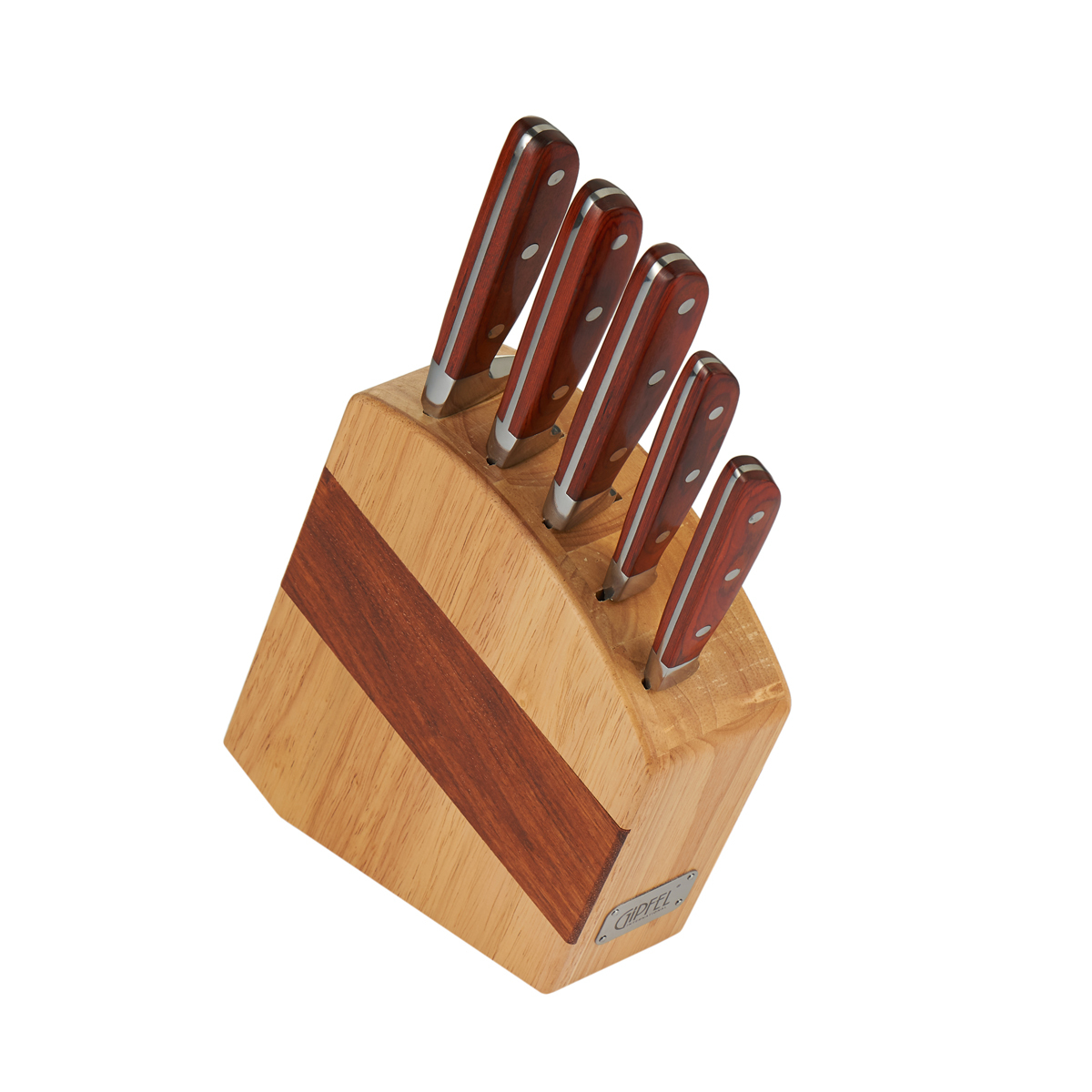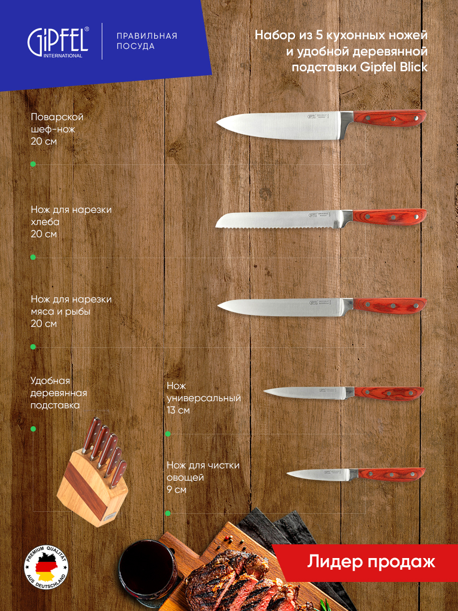 Отличный выбор для ценителей классических ножей. В данный набор входят 5 ножей различного размера, режущая часть которых выполнена из высокопрочной стали марки X30Cr13, а рукоять – из нержавейки и древеснослоистого пластика. Стоит отметить и оригинальный дизайн деревянной подставки, которая не только идеально впишется в любой кухонный интерьер, но и позволит с большим удобством доставать ножи благодаря диагональному наклону.