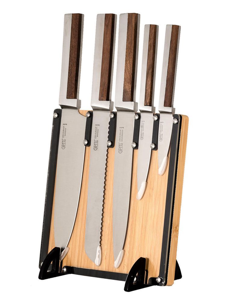 Набор ножей Gipfel FORT 8423 порадует вас не только острыми прочными лезвиями из нержавеющей стали X30Cr13, но и оригинальным дизайном в брутальном стиле, что сделает этот комплект отличным подарком для мужчины. Рукоять ножей разделена на деревянную и металлическую части. Первая состоит из дерева грецкого ореха, а вторая – из нержавеющей стали марки SS430. В состав набора входят поварской, шинковочный, хлебный, нож и для фруктов и овощей, а также подставка из бамбукового дерева.
