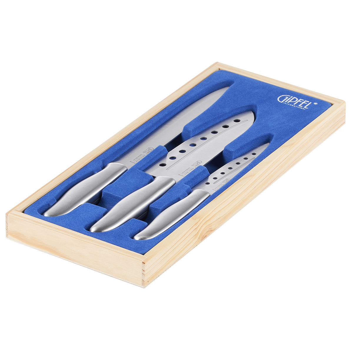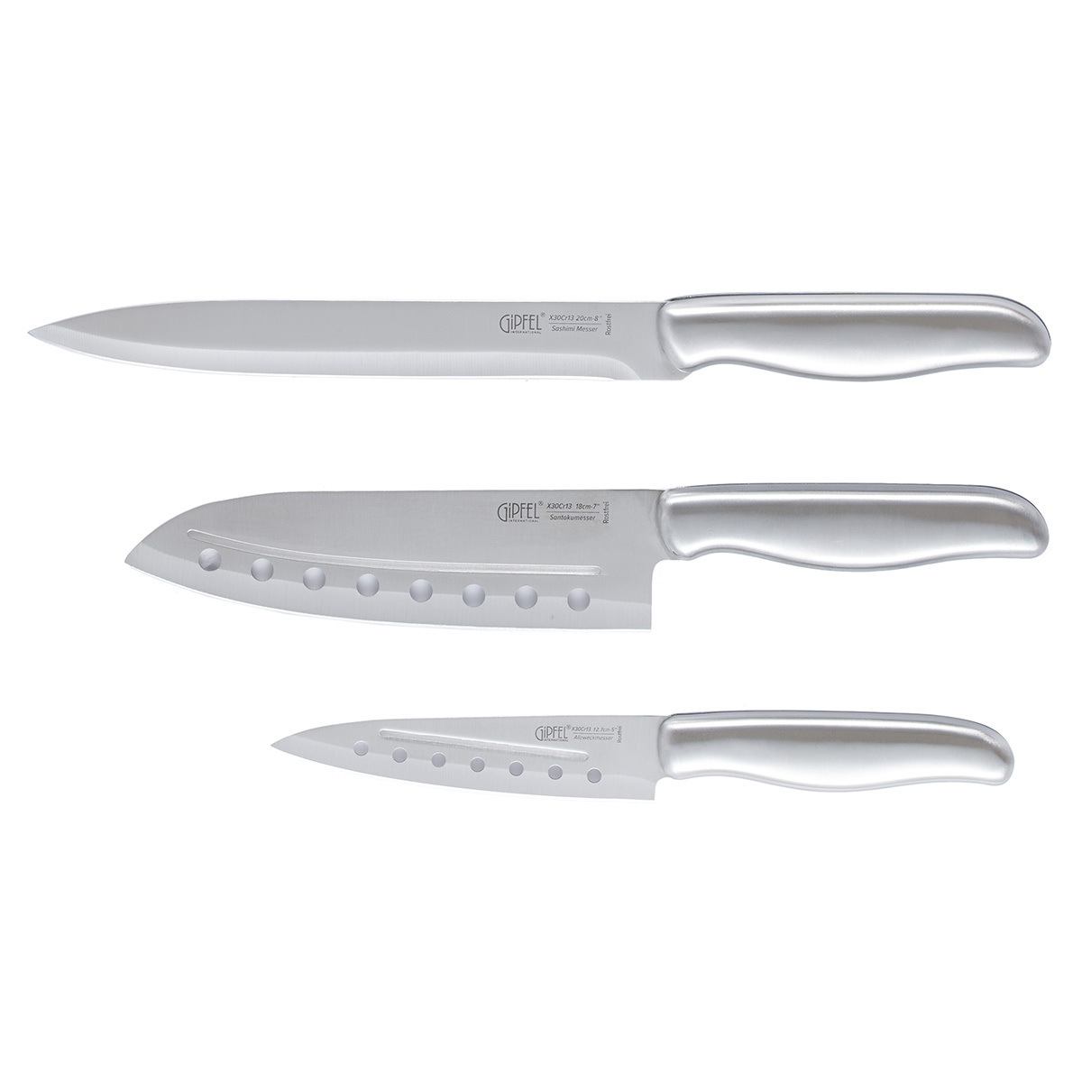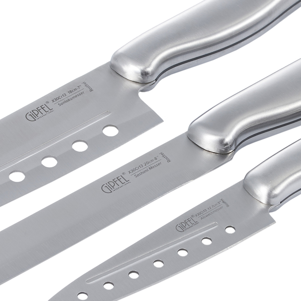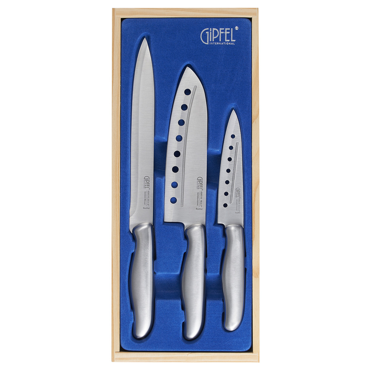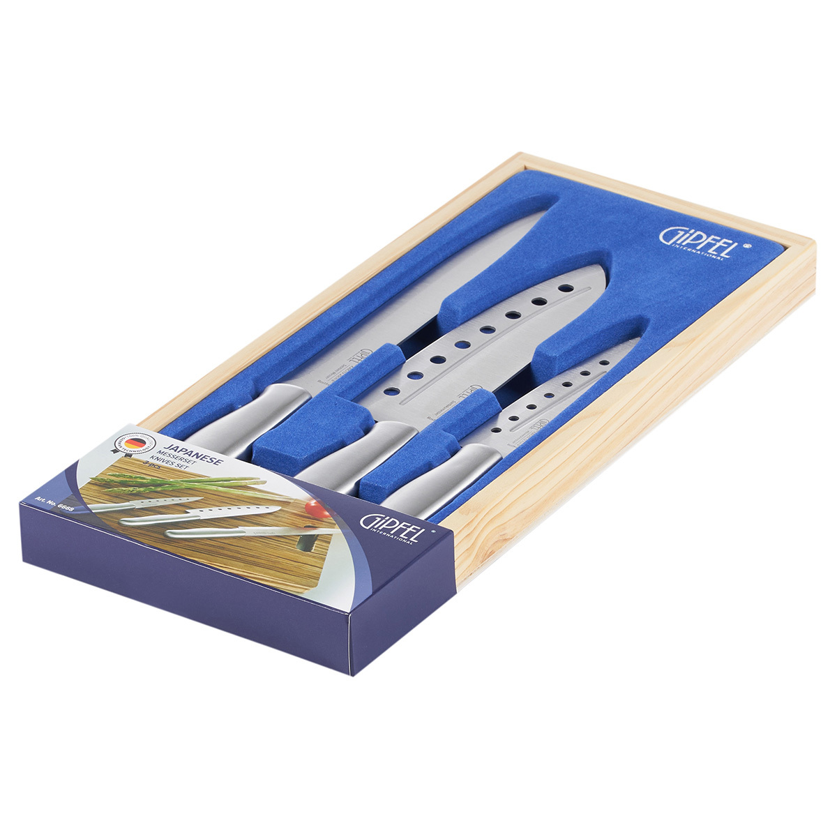 6668 GIPFEL Набор ножей JAPANESE с металличесскими ручками из 3шт в деревянном боксе. Состав: нож разделочный 20см, нож сантоку 18см, нож универсальный 13см. Материал лезвия: X30Cr13.