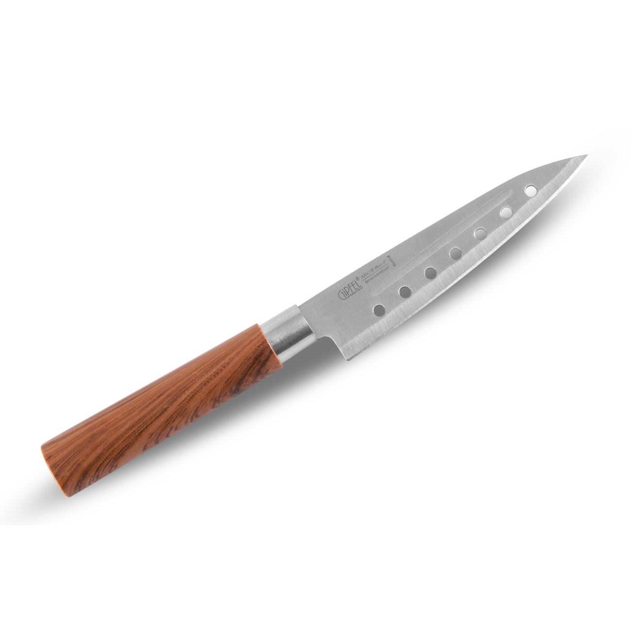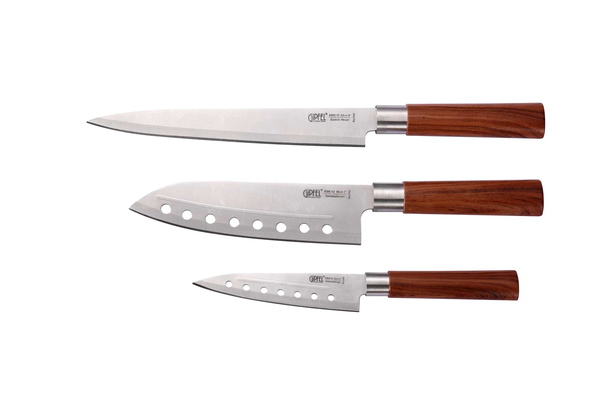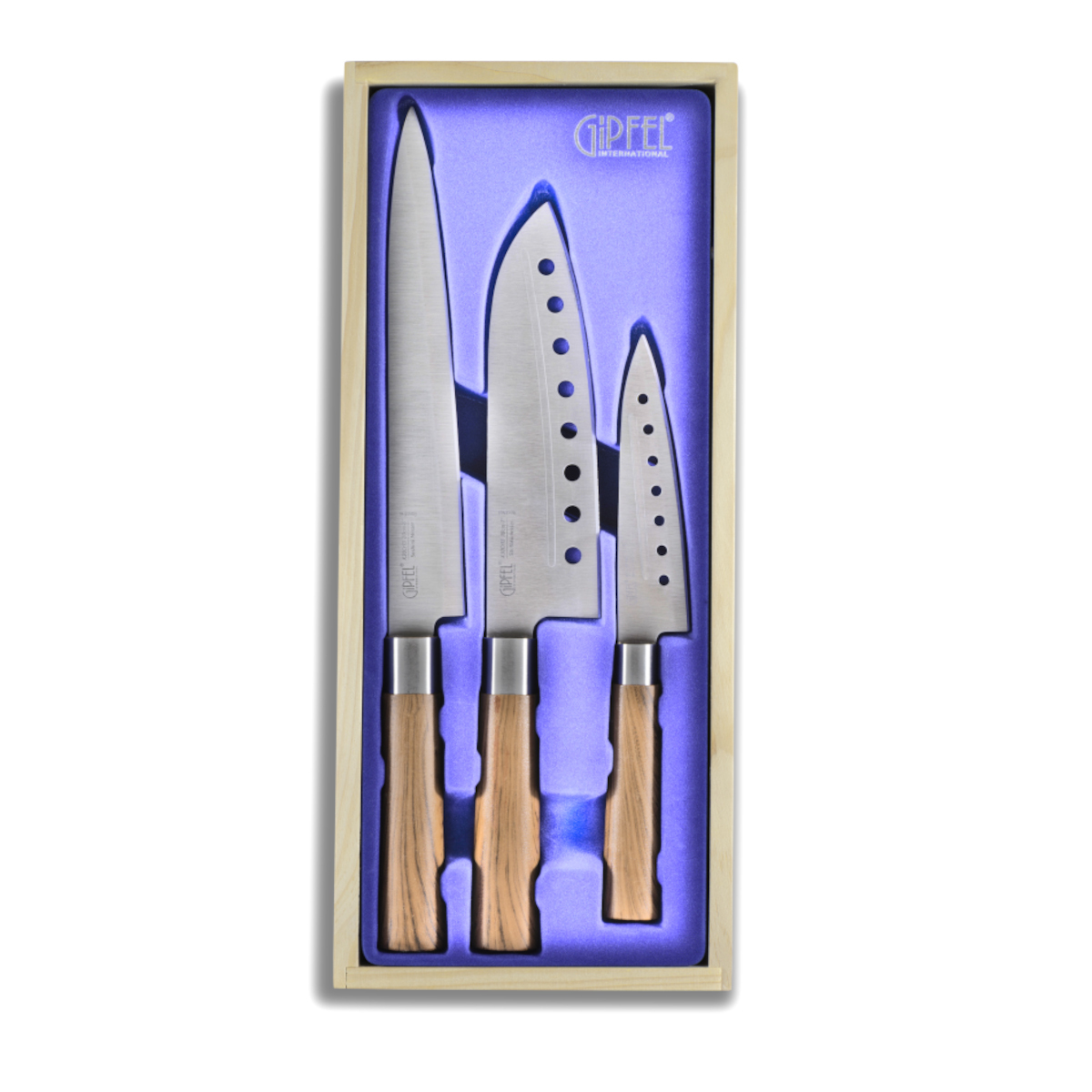 Набор ножей Gipfel JAPANESE 9864. В наборе 3 ножа в деревянном боксе. Нож разделочный с лезвием 20 см, нож сантоку с лезвием 18 см, нож универсальный с лезвием 13 см.