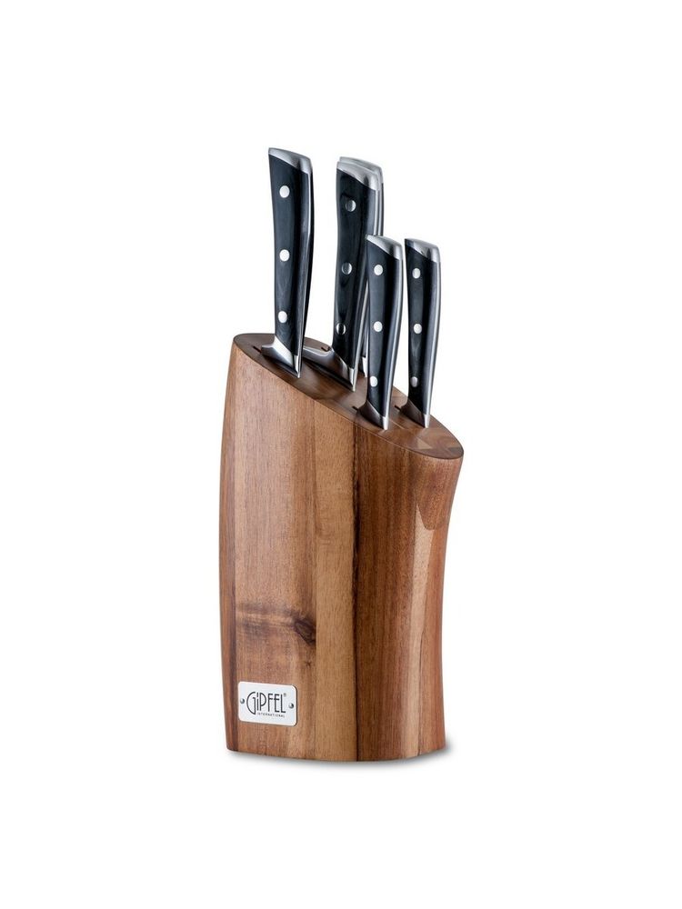 Набор ножей Gipfel Laffi black 9925 – отличное приобретение для профессионального кулинара. Ножи изготовлены из прочного стального сплава. Эргономичные ручки не дадут рукам устать в процессе длительной готовки. Профессиональная закалка и заточка лезвия ножей, наделяет их прекрасными режущими свойствами. Легко разрезают продукты любой плотности без всяких усилий. В набор входят: пять кухонных ножей и подставка из натуральной древесины акации и сосны.