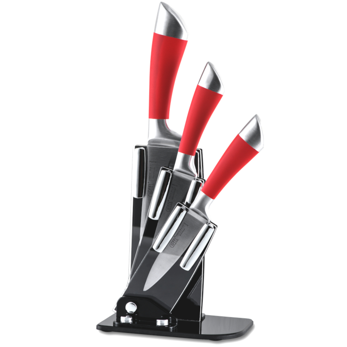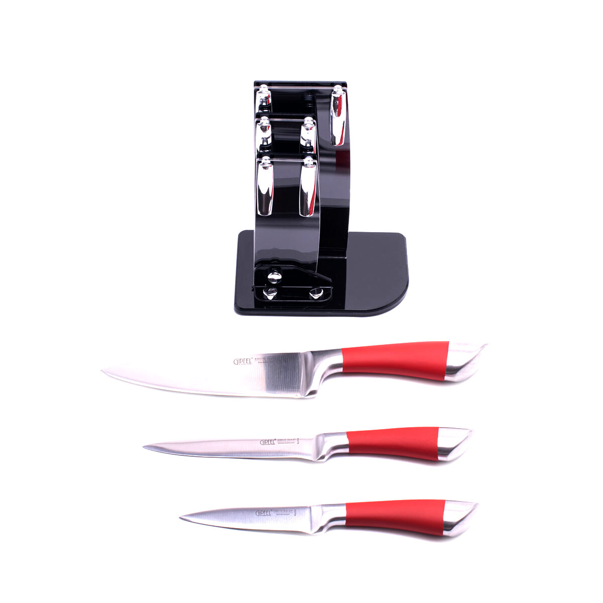 Набор кухонных ножей GIPFEL LAURITO 6987. Набор из 3 ножей на акриловой подставке. Материал лезвия: нержавеющая сталь 3CR13. Материал ручек: нержавеющая сталь, термопластичная резина.