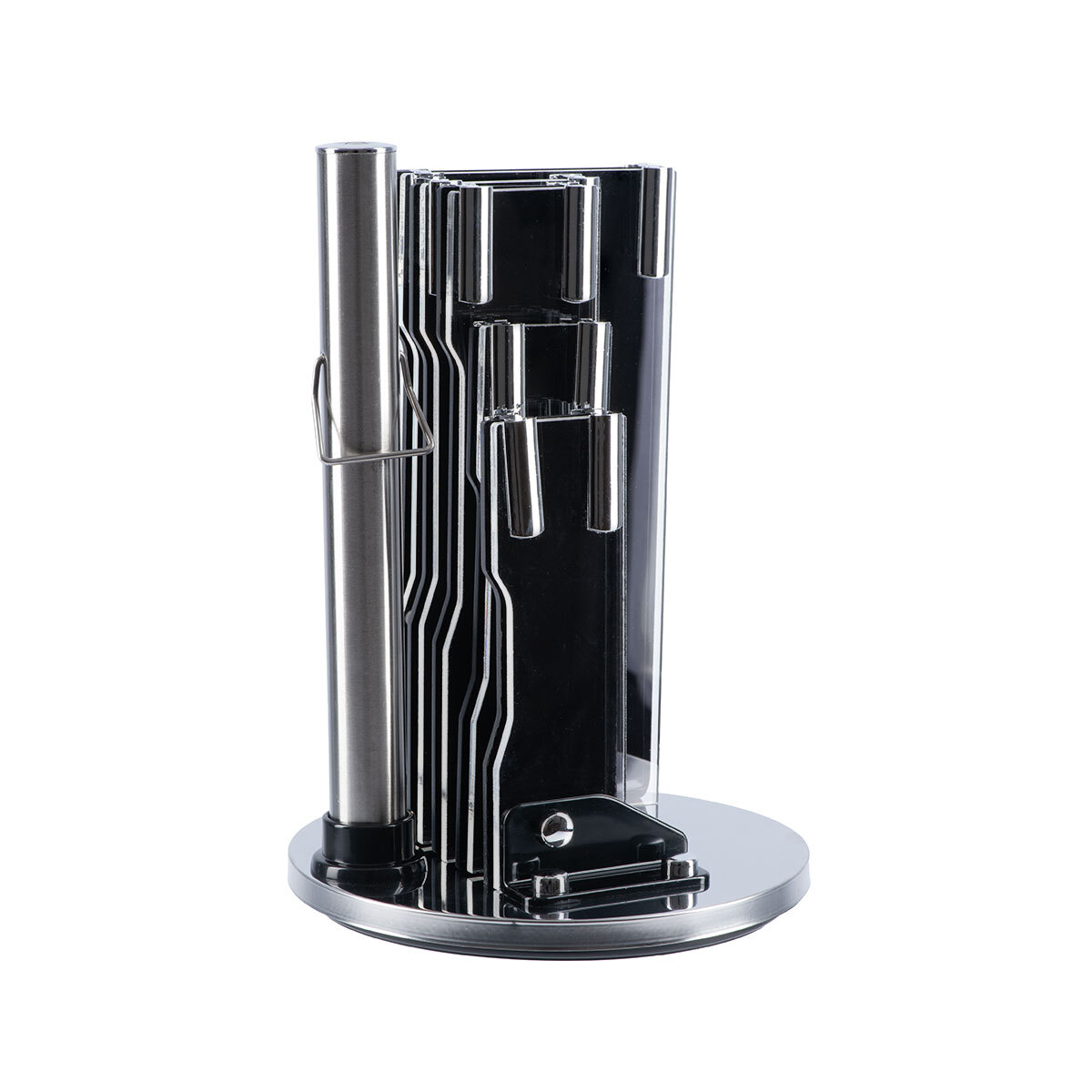 Для всех этих предметов не нужно искать место в шкафу. Для их хранения производитель подготовил стильную подставку из акрилового материала. Высота подставки без ножей - 24 см, диаметр - 17,5 см.