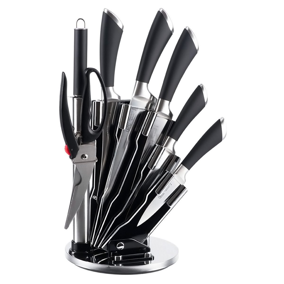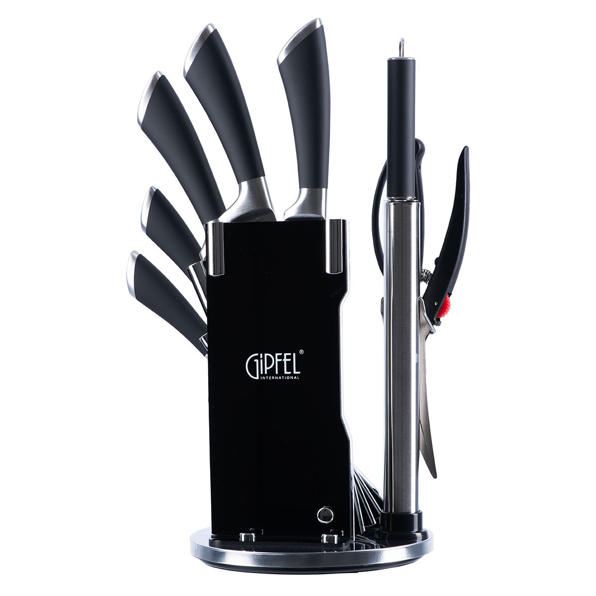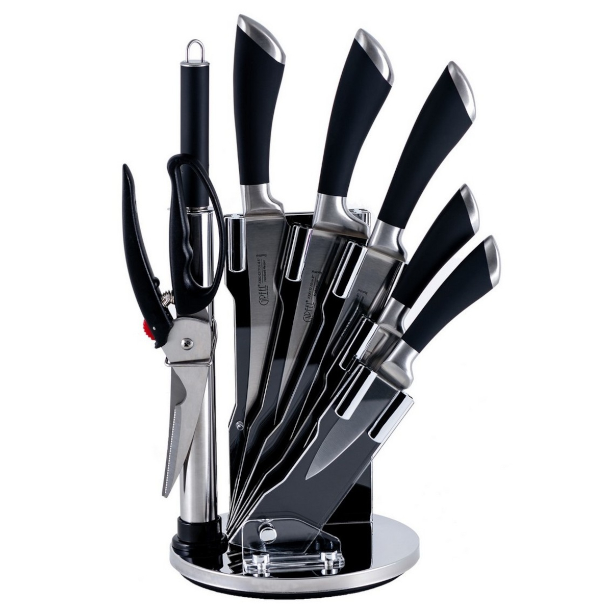 Набор кухонных ножей Gipfel Mirella 8454 из 8 предметов. Ножи различного назначения, ножницы и мусат компактно размещаются на круглой акриловой подставке, экономя место на столешнице. Лезвия ножей выполнены из стойкой к коррозии нержавеющей стали X30cr13. Ручки черного цвета изготовлены из нержавеющей стали и пластика.