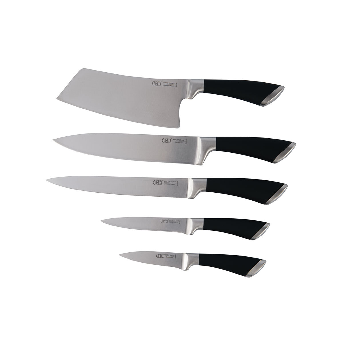 В набор входят мусат, ножницы и ножи: топорик 33 см с лезвием 17 см; поварской 33,5 см с лезвием 20 см; разделочный 33 см с лезвием 20 см; универсальный 23 см с лезвием 13 см; овощной 19,5 см с лезвием 9 см.