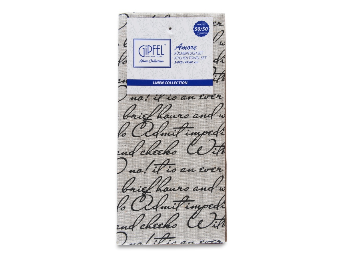 Набор кухонных полотенец GIPFEL AMORE 45012. В наборе 2 полотенца бежевого цвета с принтом в виде надписей. Размер полотенец 47х61см. Материал: 50% лён, 50% хлопок. Полотенца из натурального материала отлично впитывают влагу, не оставляют разводов и ворсинок на поверхности.