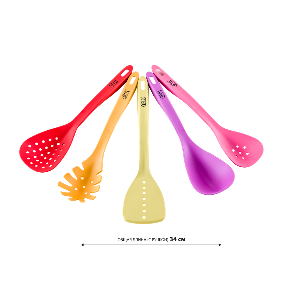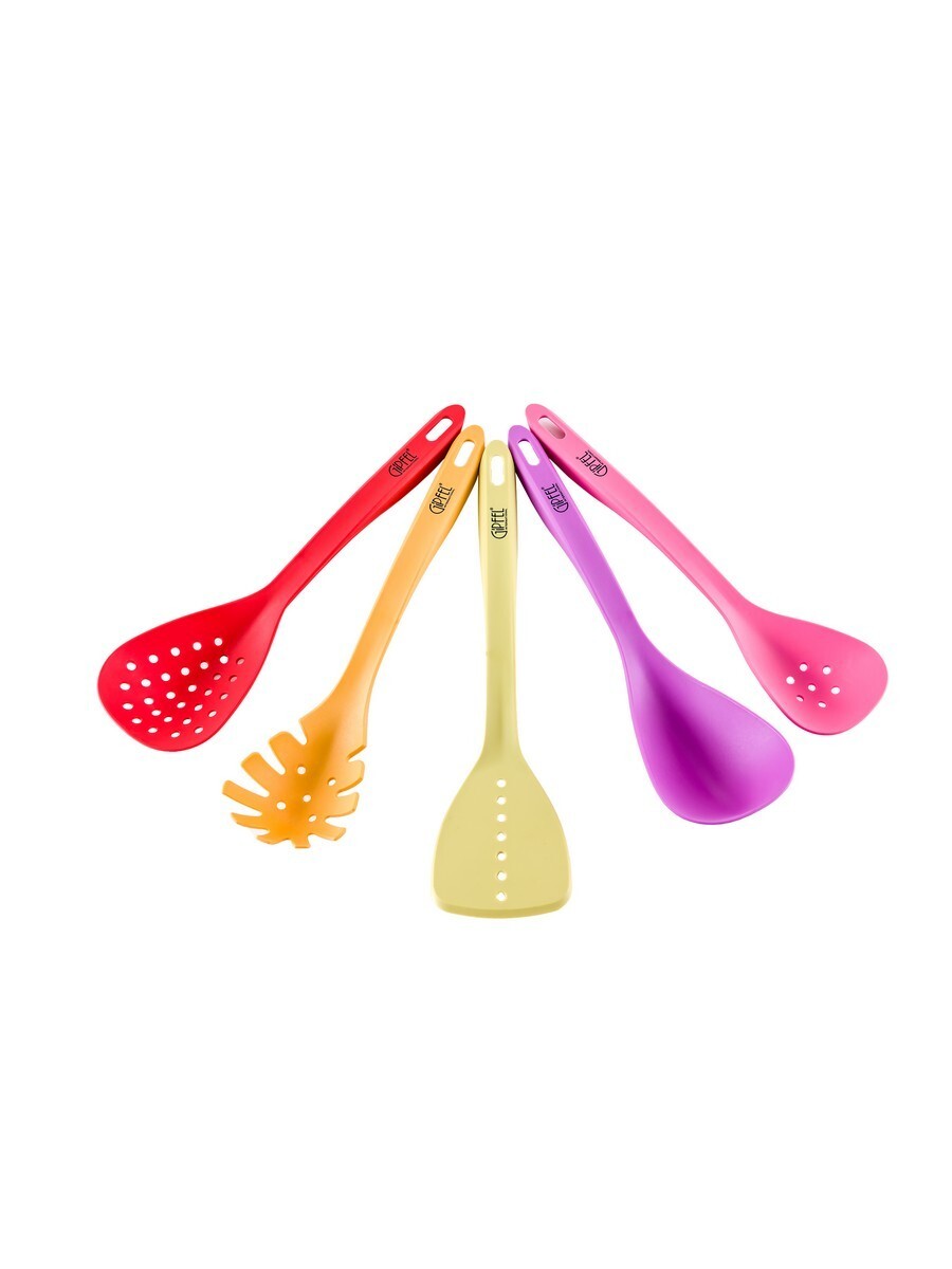 Набор кухонных принадлежностей Gipfel 6330й из 5 предметов. В наборе разноцветные кухонные инструменты: лопатка, ложка для спагетти, ложка с отверстиями, шумовка, половник. Инструменты сделаны из пластика и нейлона, ручки с петлей для подвешивания. Их можно использовать с кастрюлями и сковородами, имеющими антипригарное покрытие. Длина предметов 34,5 см.