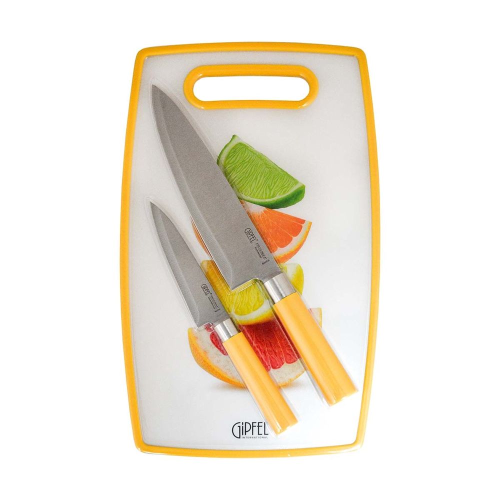 Набор кухонный Gipfel 51083 из 3 предметов. В наборе: доска разделочная пластиковая с изображением долек цитрусовых 23х37 см; нож поварской 20 см; нож универсальный 13 см. Материал лезвия: X30Cr13. Рукоятки ножей сделаны из пластика.