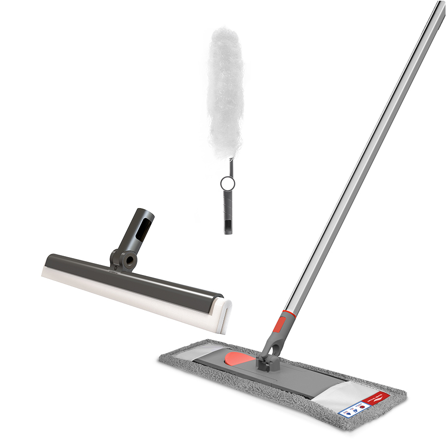 Набор Мультишвабра от бренда Nordic Stream, включающий в себя три основания для швабры, насадку и телескопическую ручку, поможет осуществить быструю и эффективную уборку, сбережет ваши силы и сэкономит время. Гибкая метелка для пыли с насадкой из микрофибры c разделенными волокнами притягивает пыль при помощи электростатической силы, собирает ее, не позволяя подниматься в воздух. Швабра-скребок с прочным пластиковым корпусом, в основе которого зафиксирован сквидж для воды, идеально подходит для уборки в ванной комнате, на кухне, на террасе или у бассейна. Она отлично удаляет воду и моющие средства даже в стыках напольных покрытий. Сменная насадка из жесткой микрофибры предназначена для интенсивной влажной уборки, эффективно справляется со сложными пятнами и твердой грязью, не царапая пол. Микрофибра подходит для всех типов напольных покрытий: кафеля, керамогранита, ламината, дерева и линолеума. Насадки надежно крепятся на флаундере, что препятствует их соскальзыванию в процессе уборки. Микрофибра выдерживает до 300 стирок при температуре до 60˚. Съемное основание, изменяющее уровень наклона швабры, и телескопическая ручка облегчат уборку в труднодоступных местах. Ручка снабжена удобным механизмом, который фиксирует две его части в раздвижном положении, препятствуя самопроизвольному сложению. Аксессуар дополнен пластиковым колпачком с кольцом для подвешивания.
