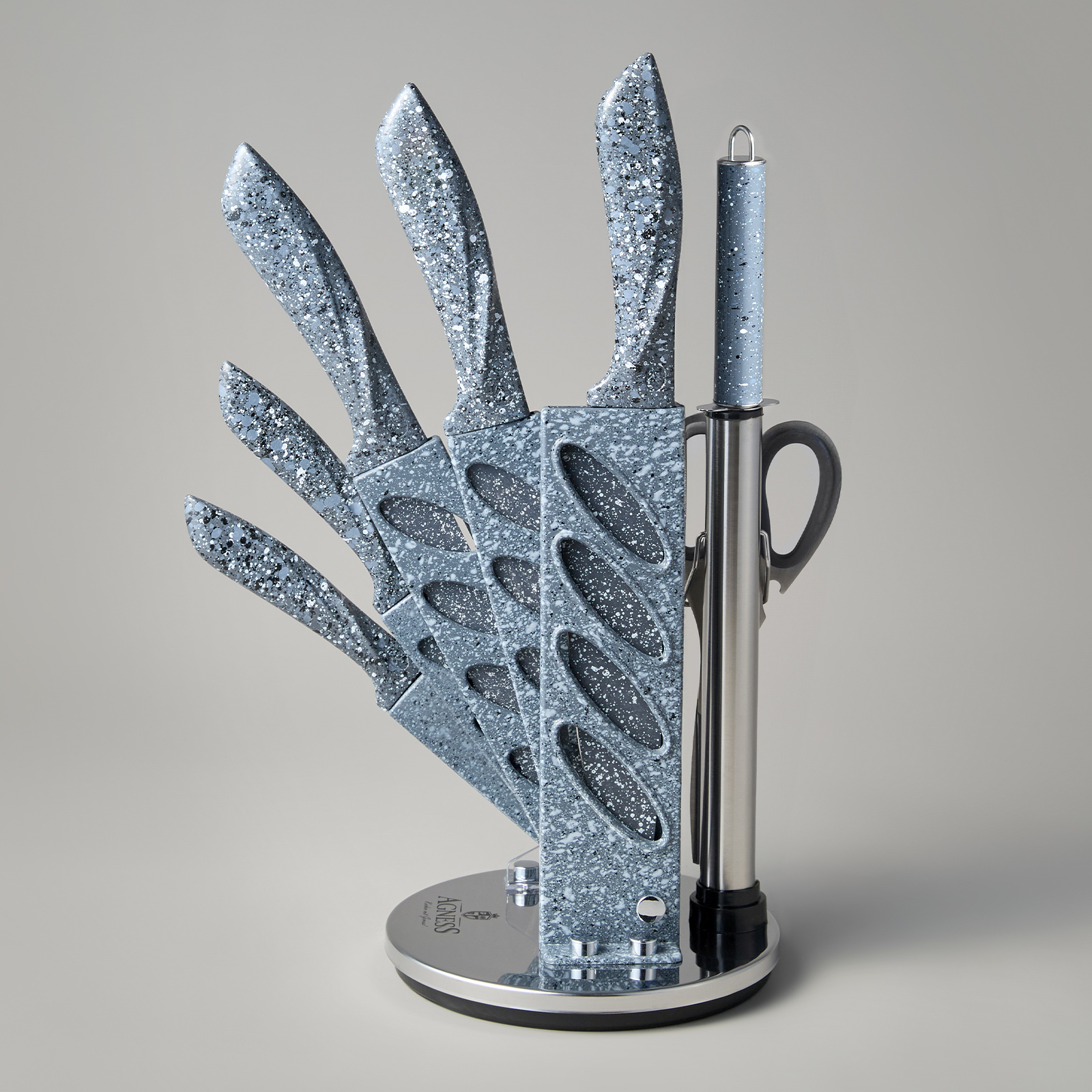 ● Состав набора: Нож поварской 20см, Нож для хлеба 20см, Нож для нарезки 20см, Нож универсальный 12,5см, Нож для чистки овощей и фруктов, 9см, Муссат, Ножницы, Пластиковая подставка для безопасного хранения ножей