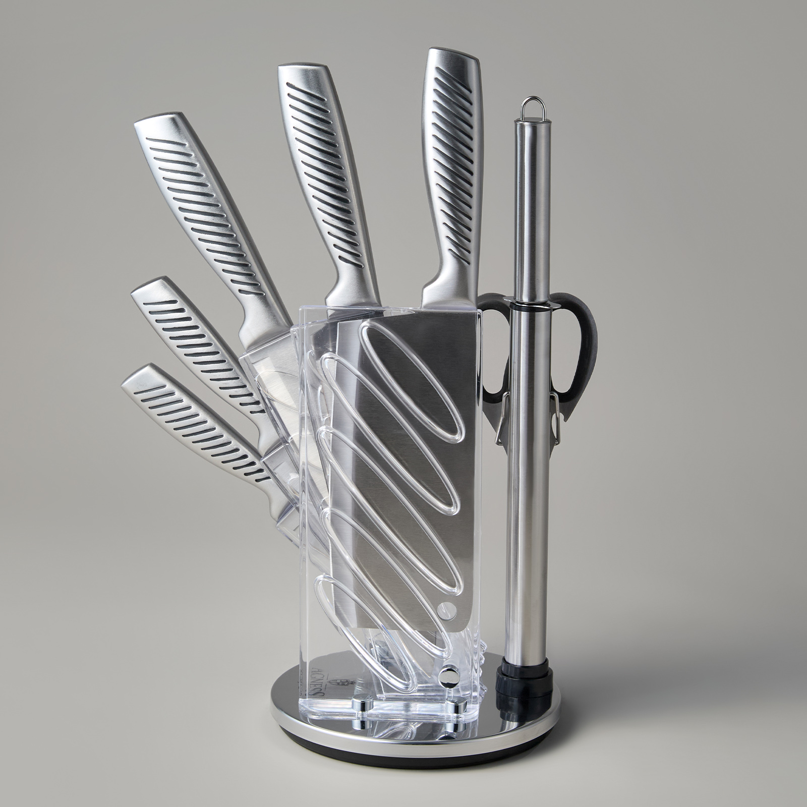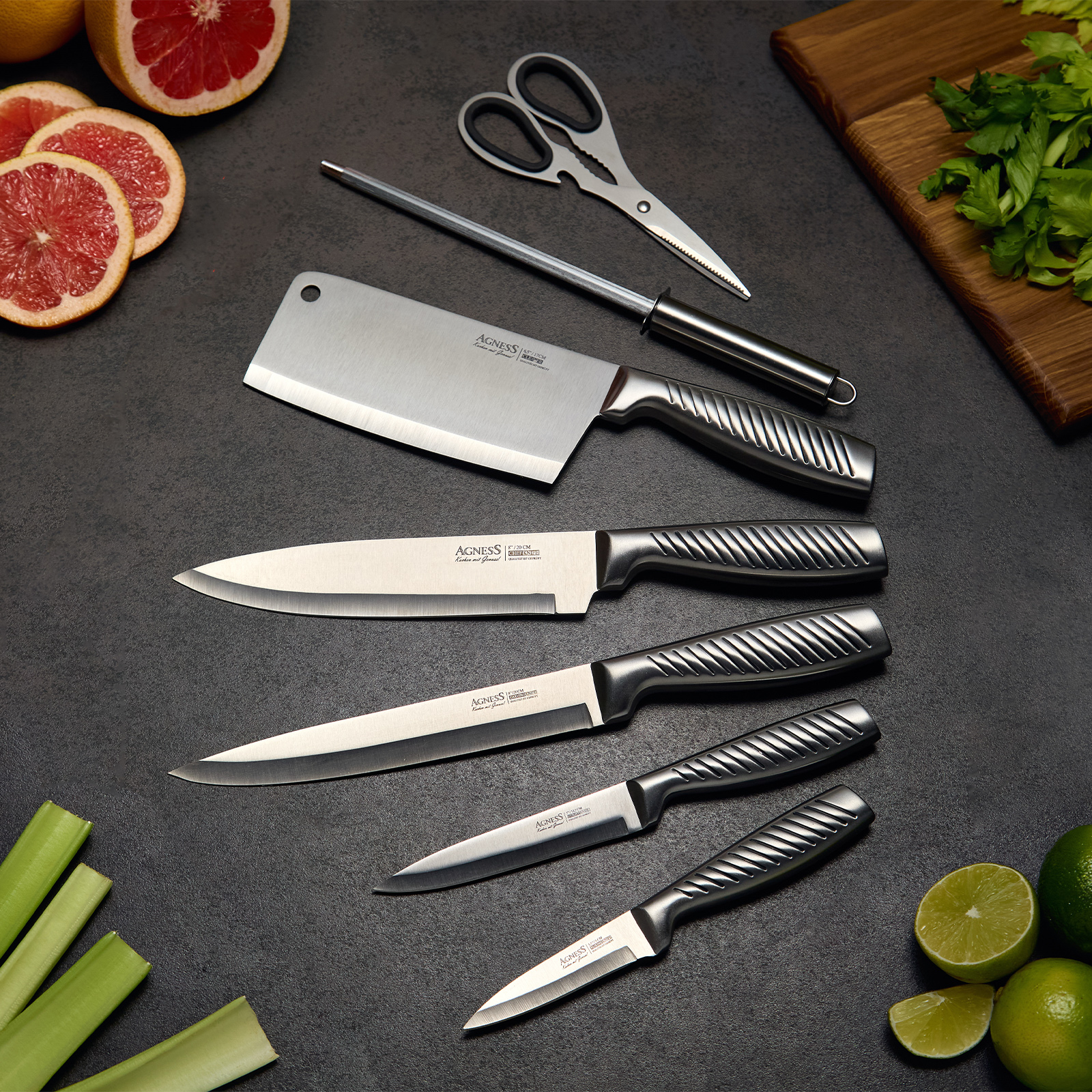 ● Состав набора: Топорик 17см, Нож поварской 20см, Нож для нарезки 20см, Нож универсальный 12,5см, Нож для чистки овощей и фруктов, 9см, Мусат, Ножницы для птицы, Складывающаяся подставка.