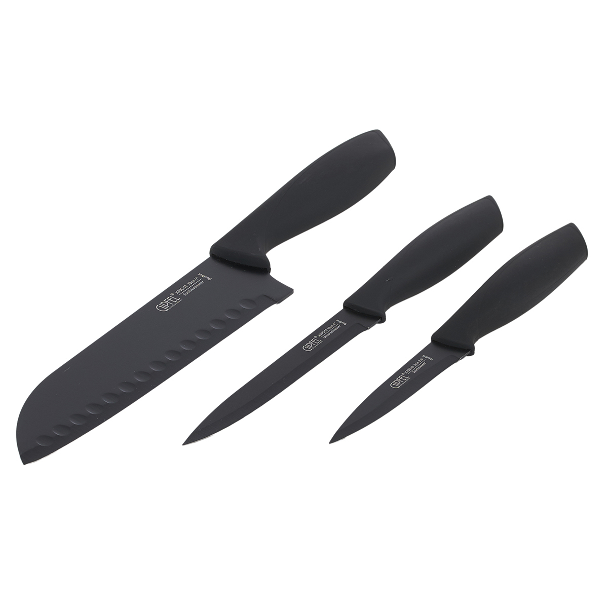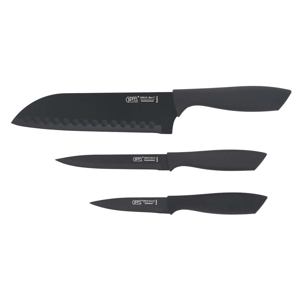 Набор ножей GIPFEL 51086 из 3 предметов. В наборе: нож сантоку 17см, нож универсальный 13см, нож для чистки овощей 9см. Материал лезвия: X30Cr13.Рукоять: пластик, термопластичная резина. Твердость по шкале Роквелла: 52 ±2. Ручки и лезвия ножей черного цвета. Ручки имеют удобную для захвата эргономичную форму.