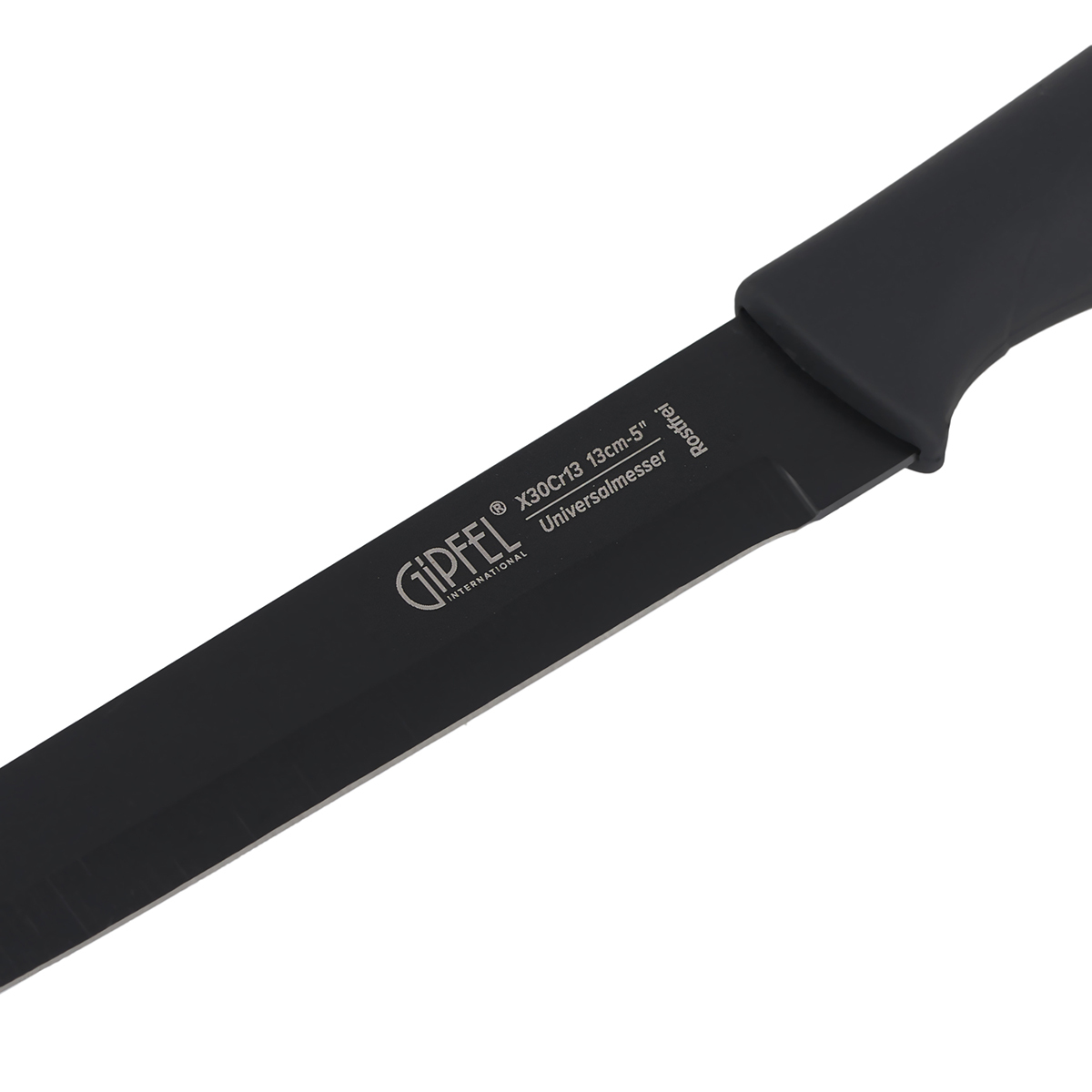 Набор ножей Gipfel 51086 из 3 предметов. В наборе: нож сантоку 17 см, нож универсальный 13 см, нож для чистки овощей 9 см. Материал лезвия: X30Cr13.Рукоять: пластик, термопластичная резина. Твердость по шкале Роквелла: 52 ±2. Ручки и лезвия ножей черного цвета. Ручки имеют удобную для захвата эргономичную форму.