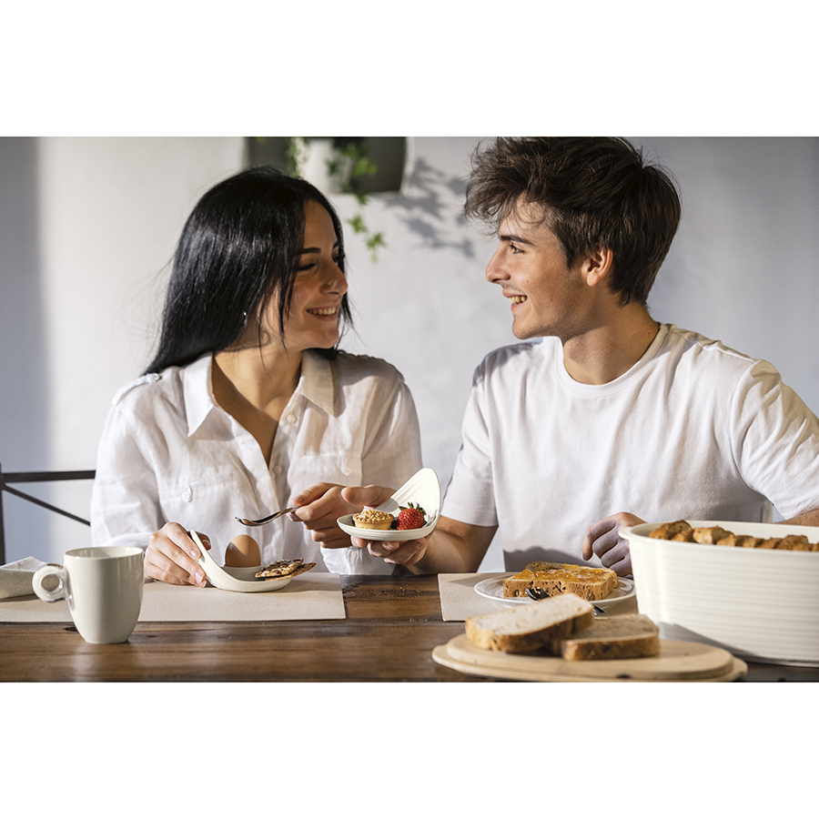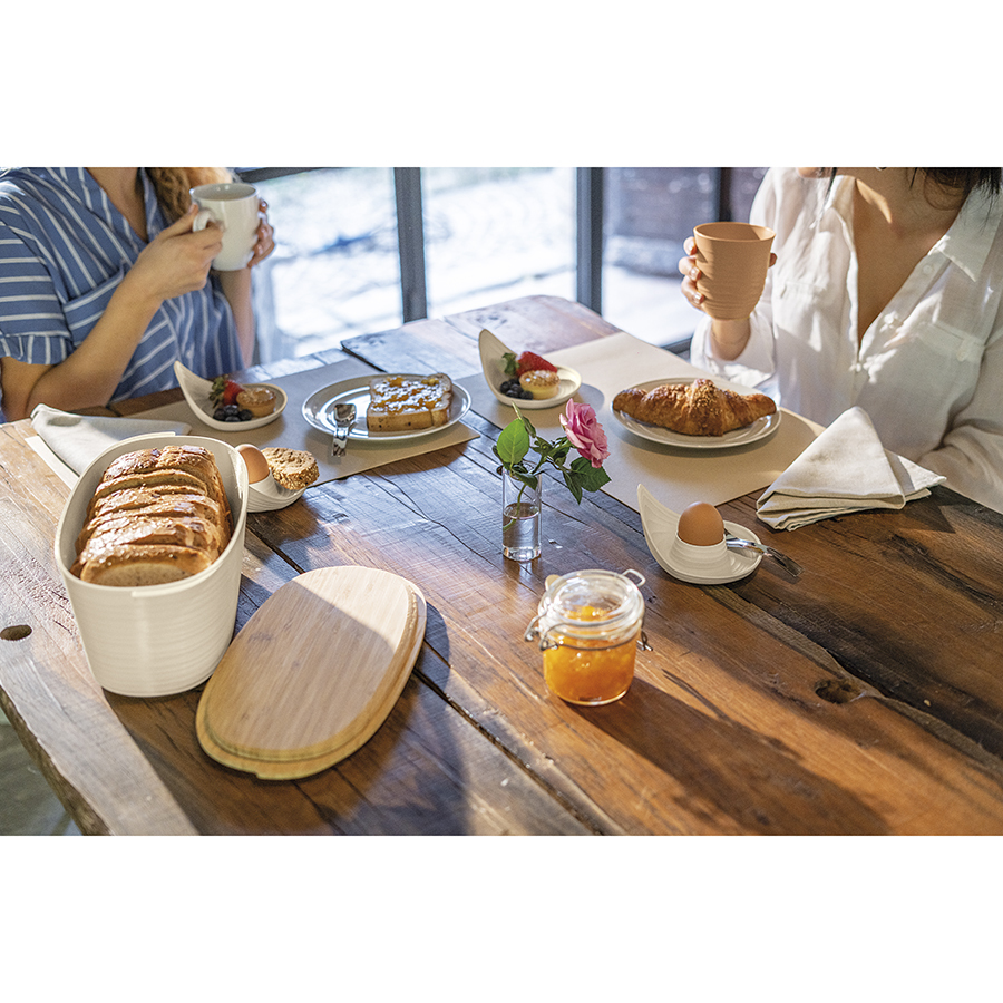 Подставки для яиц выполнены из переработанного пластика. Дизайн изделий напоминает керамику, а реалистичности внешнему виду придают тщательно подобранные пастельные тона и неровные круговые узоры, создающие эффект ручной работы.