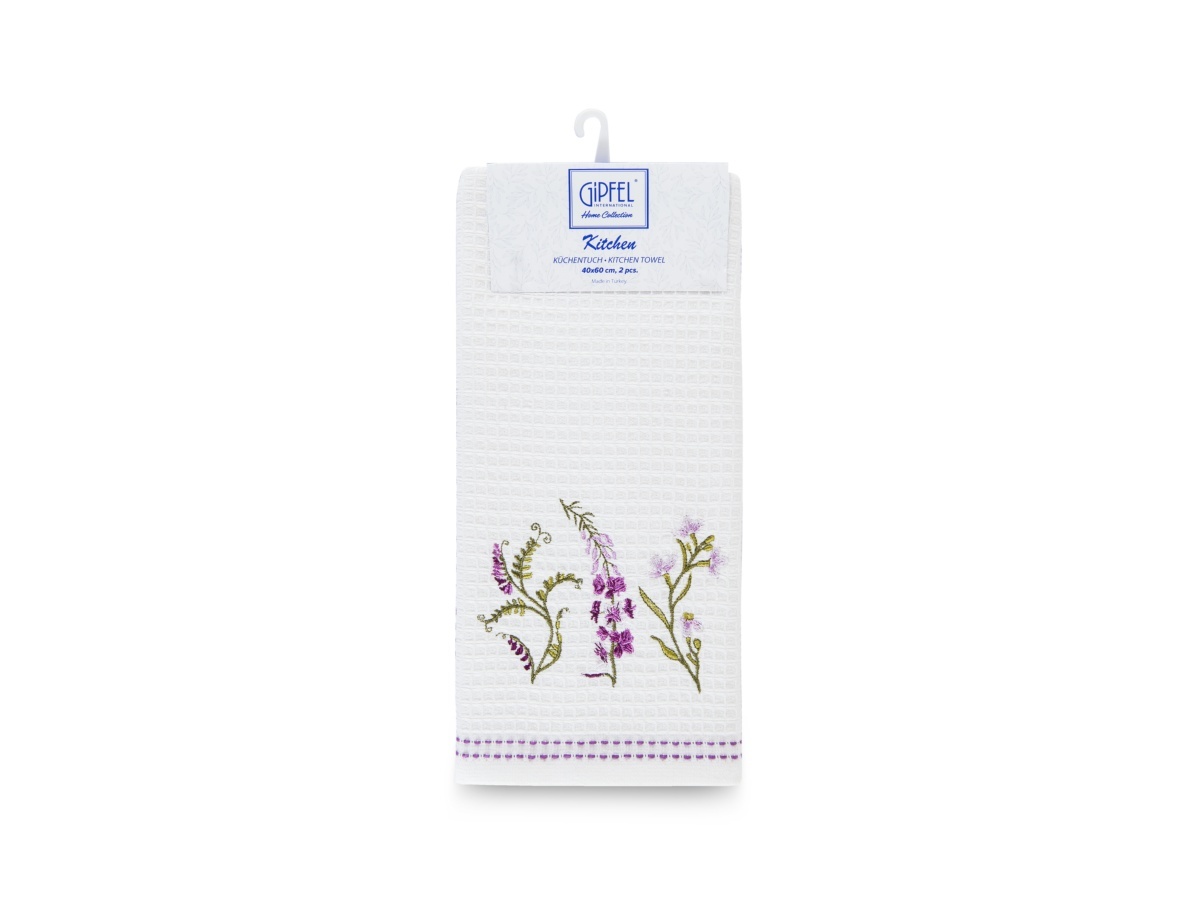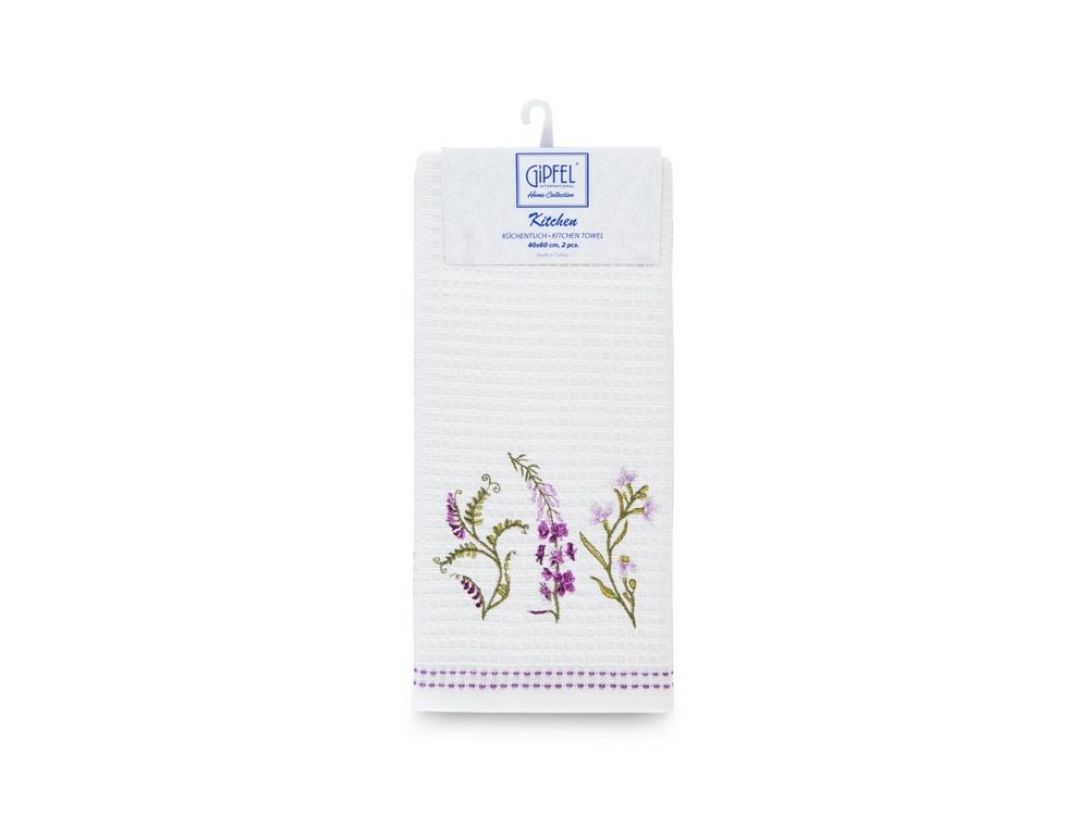 Набор полотенец Gipfel Kitchen 40790. В наборе 2 хлопковых полотенца: белое с изображением сиреневых полевых цветов и сиреневое. Полотенца выполнены из 100% хлопка, плотность нитей 350 г/м2. Размер полотенец 40x60 см.