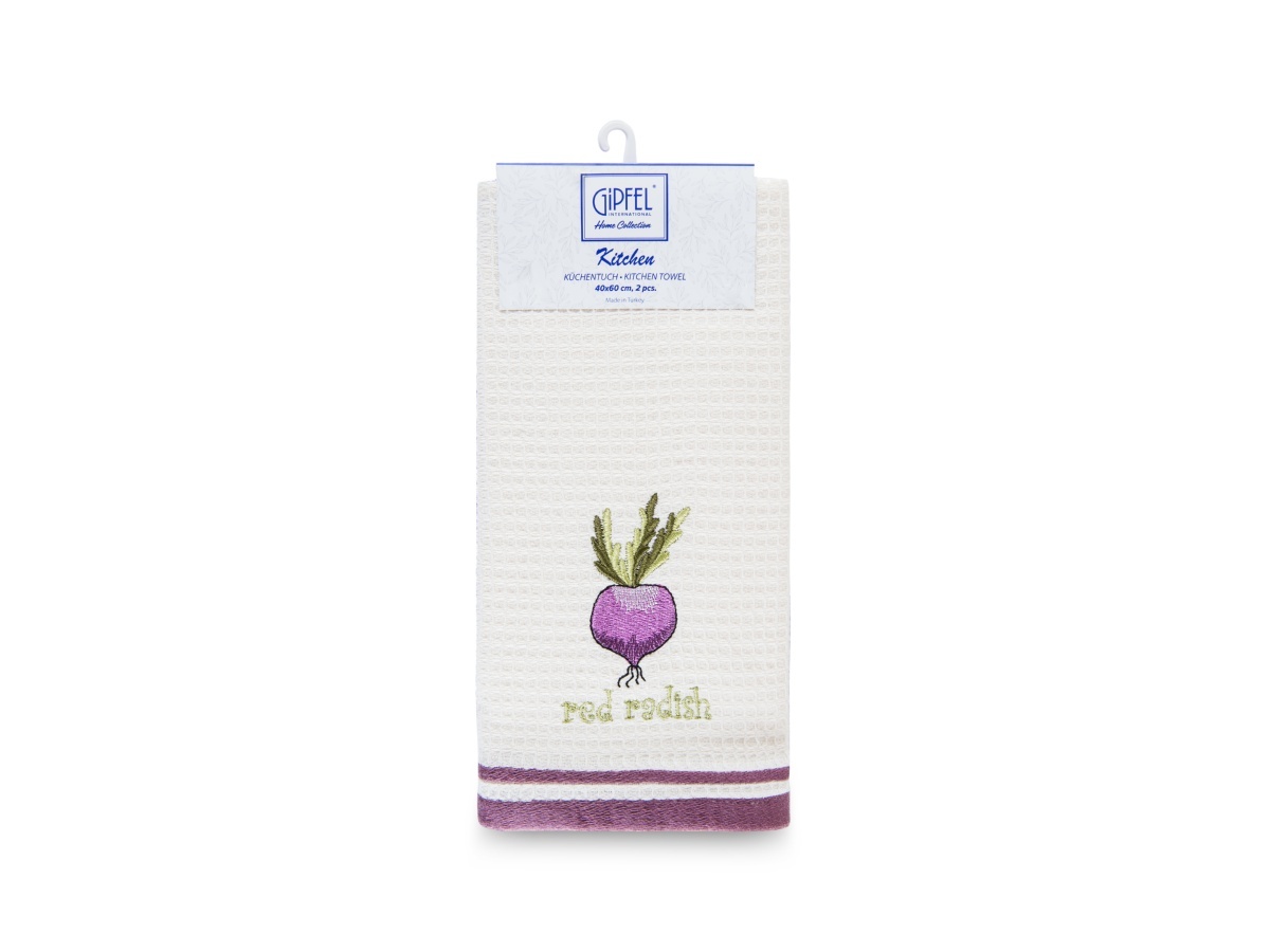 Набор полотенец Gipfel Kitchen 40793. В наборе 2 хлопковых полотенца: белое с вышивкой спелого редиса и сиреневое. Полотенца выполнены из 100% хлопка, плотность нитей 350 г/м2. Размер полотенец 40x60 см.