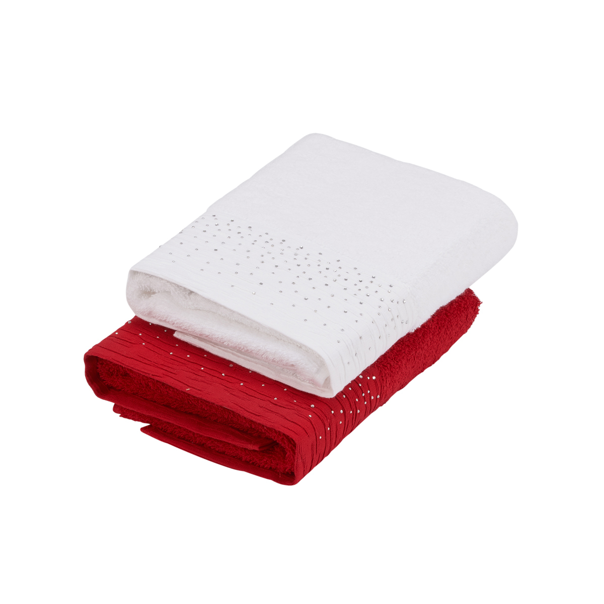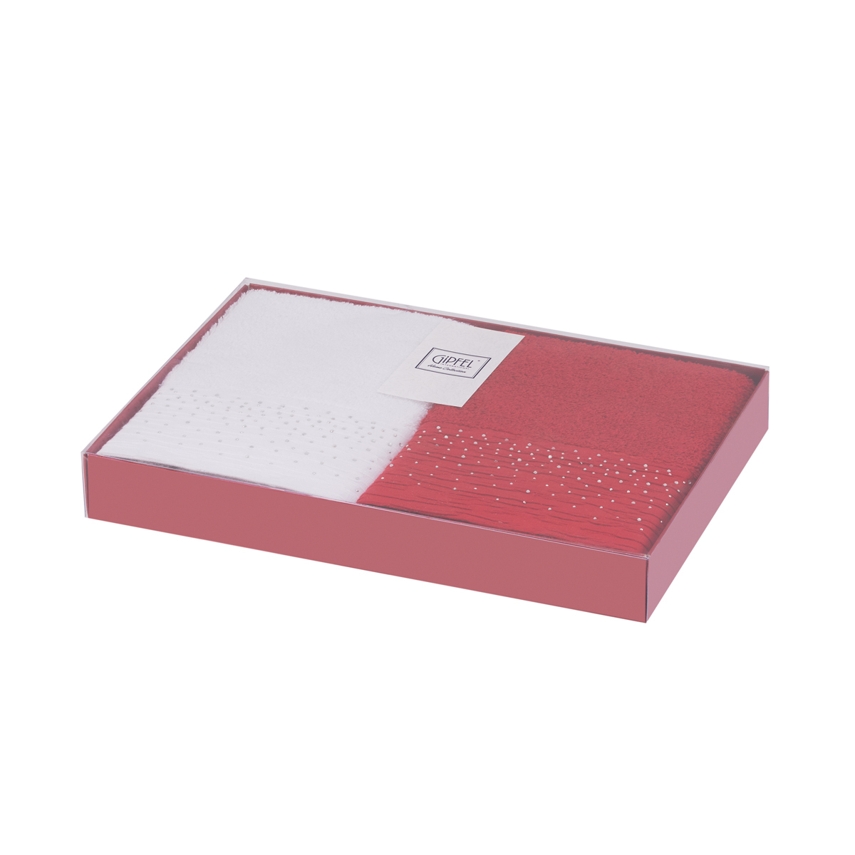 Набор полотенец Gipfel SHINY STONES 40656. В наборе 2 полотенца, красное и белое, из натурального хлопка размером 50x90 см. Края полотенец украшены широкой окантовкой из жатой ткани с блестками. Разные размеры позволяют использовать полотенца для рук и лица. Упакованы в красивую подарочную коробку.