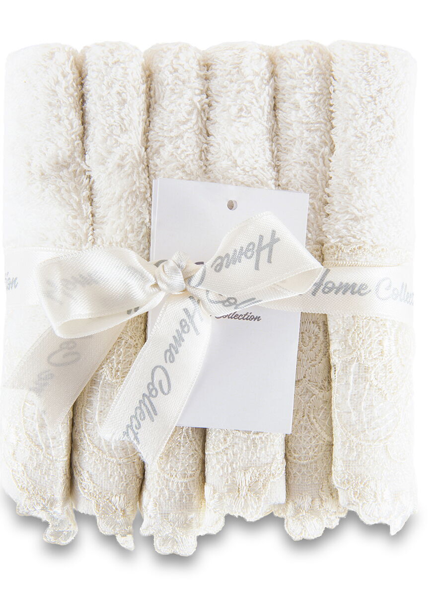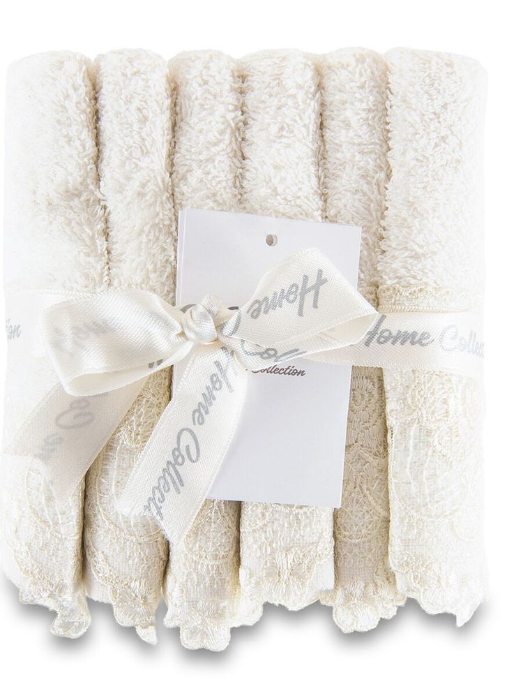 Набор полотенец махровых для рук Gipfel SENORITA 47125. В наборе 6 полотенец белого цвета, украшенных кружевом по краю. Размер полотенец: 30x30 см. Полотенца выполнены из 100% хлопка, плотность нити 450 гр/м2. Махровые полотенца невероятно мягкие и выполнены из натурального материала.