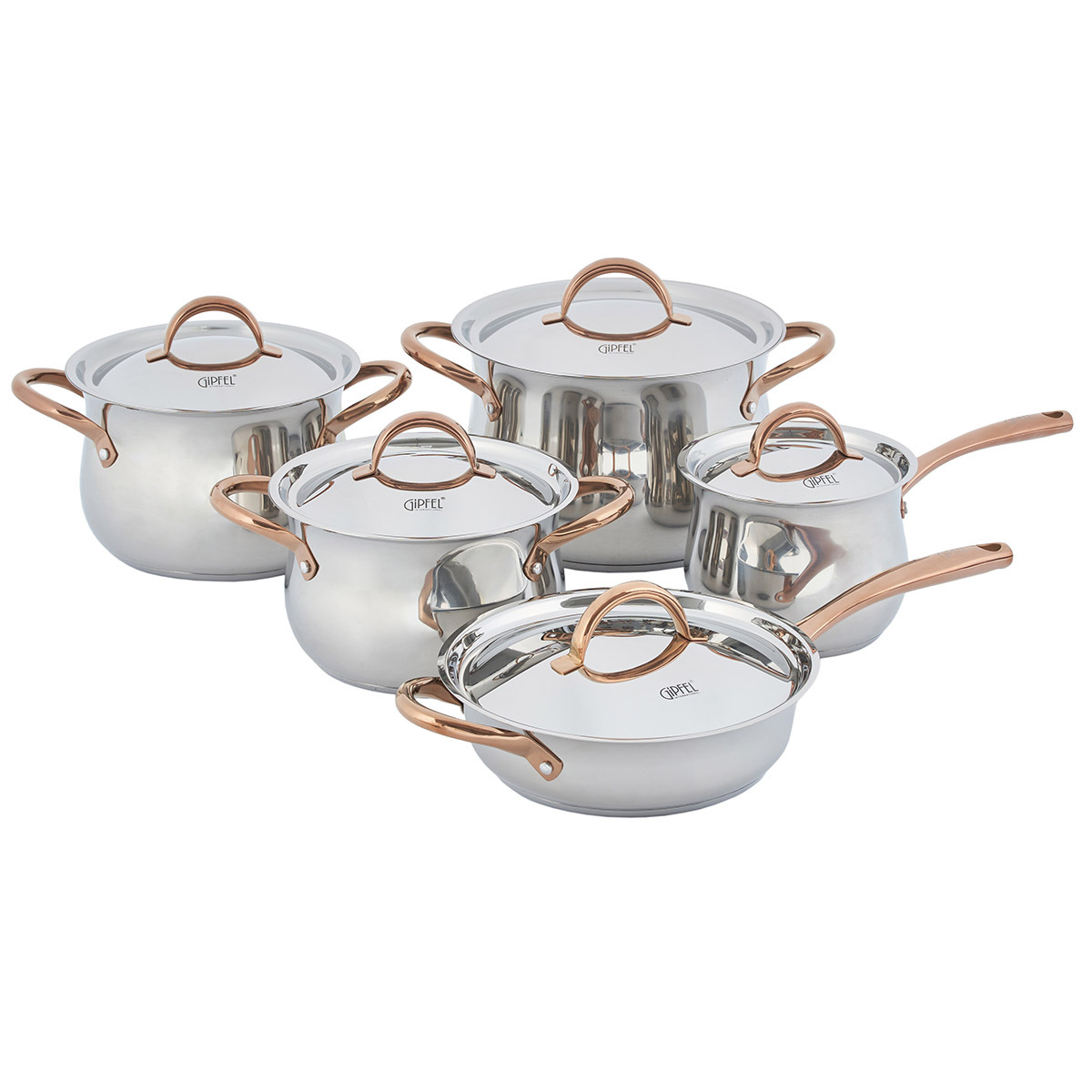 Набор посуды из нержавеющей стали Gipfel Absolute 51907. Набор состоит из 10 предметов. Ковш 16х13 см/2,4 л, 3 кастрюли: 20х13 см/3,9 л, 20х15 см/4,7 л, 24х17 см/7,7 л и сковорода-сотейник 26х7 см/3,7 л со стальными крышками.