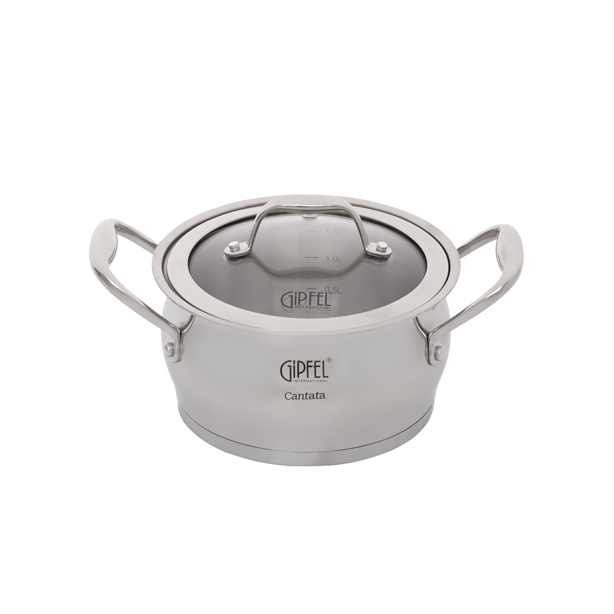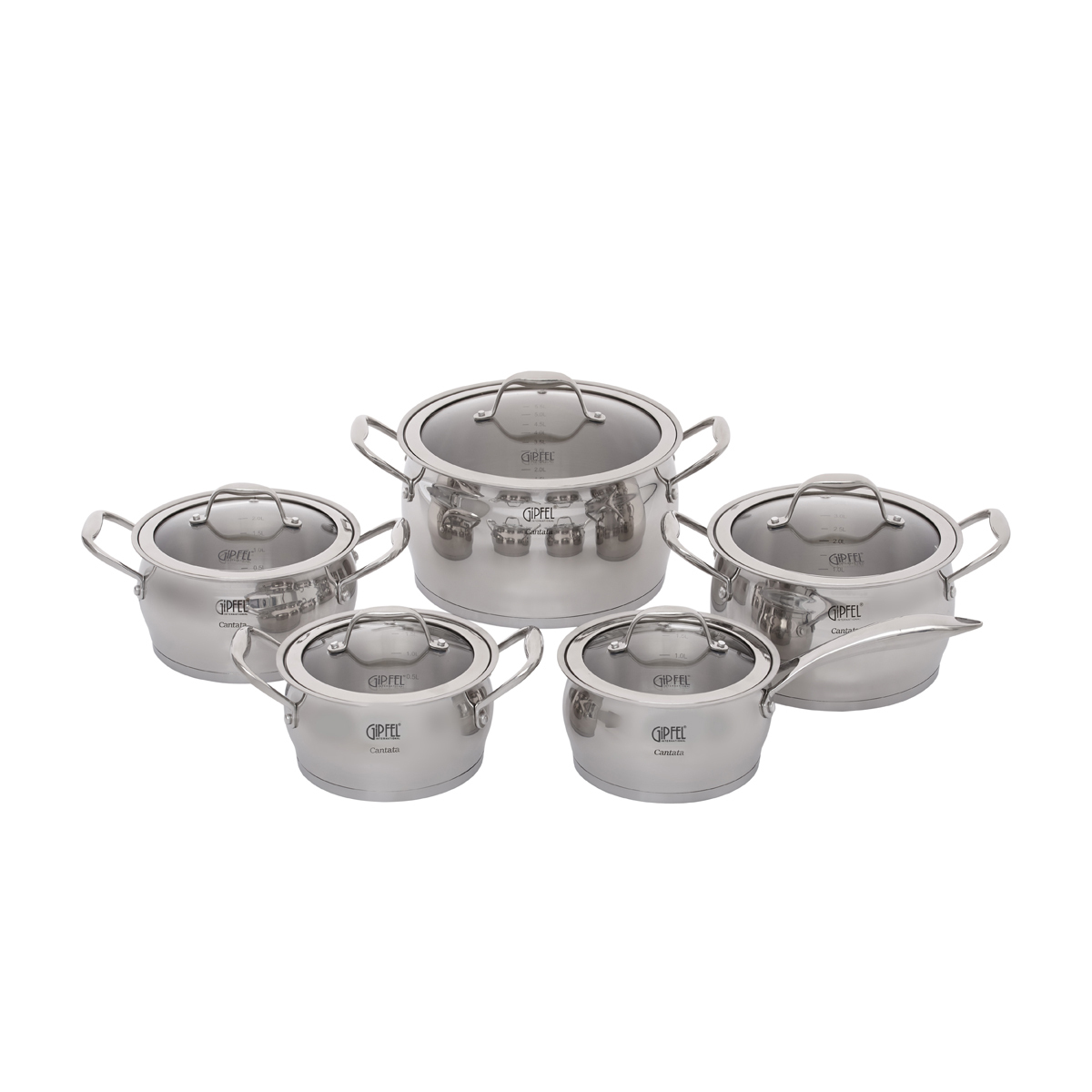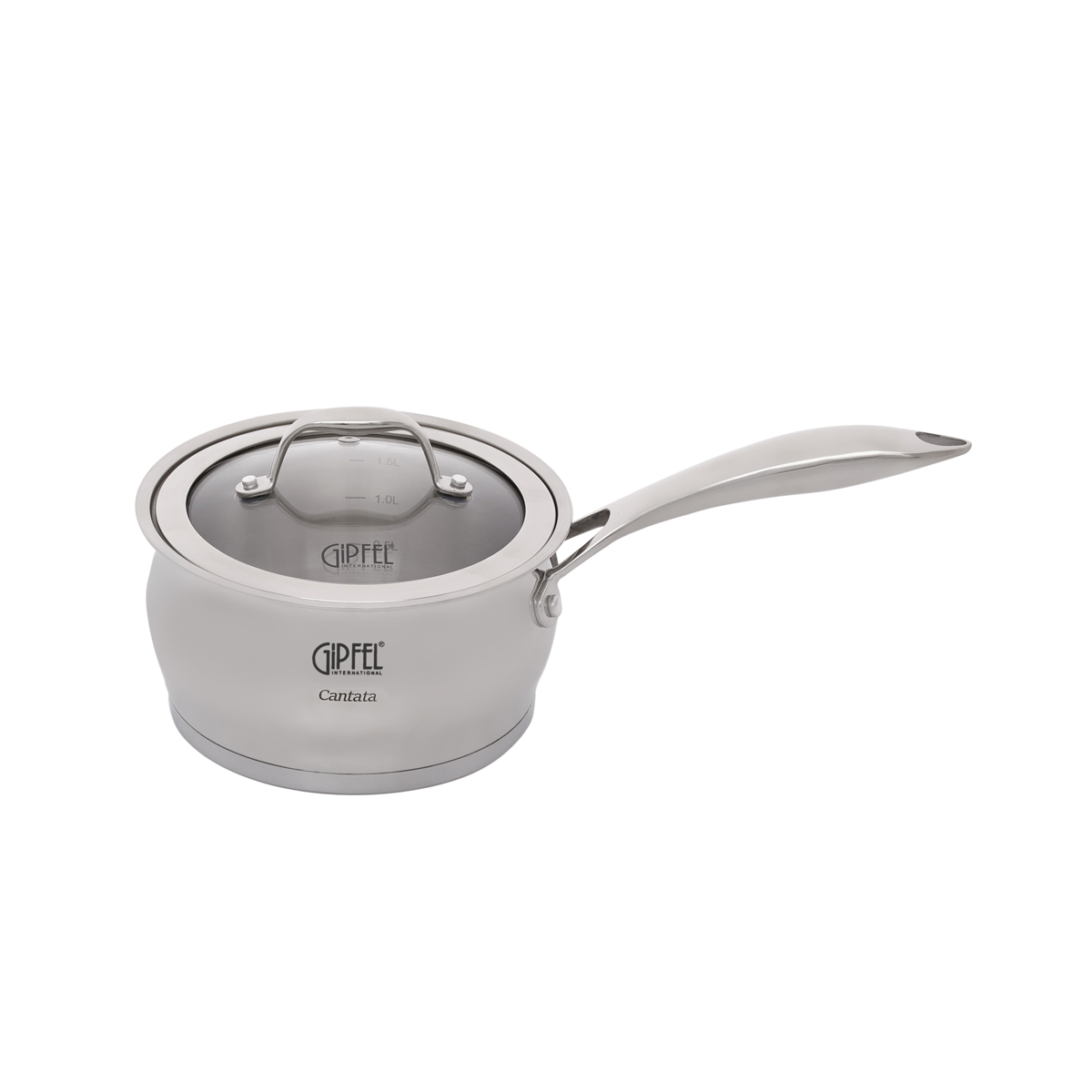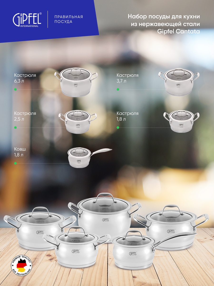 В набор посуды Gipfel Cantata 1538 входят кастрюли на 1,8, 2,8, 3,5 и 6 л, а также ковш объемом 1,8 л.