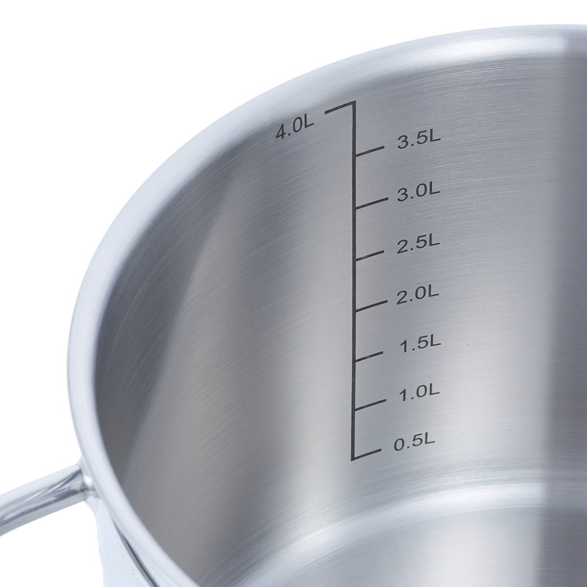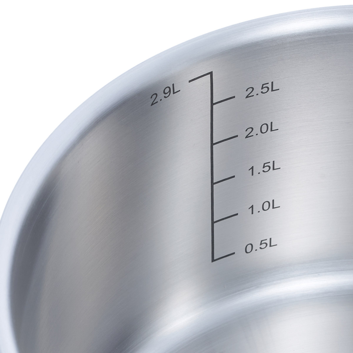 Внутри посуды нанесена мерная шкала в литрах, с помощью которой удобно отмерить нужное количество воды и следить за ее уровнем при готовке.