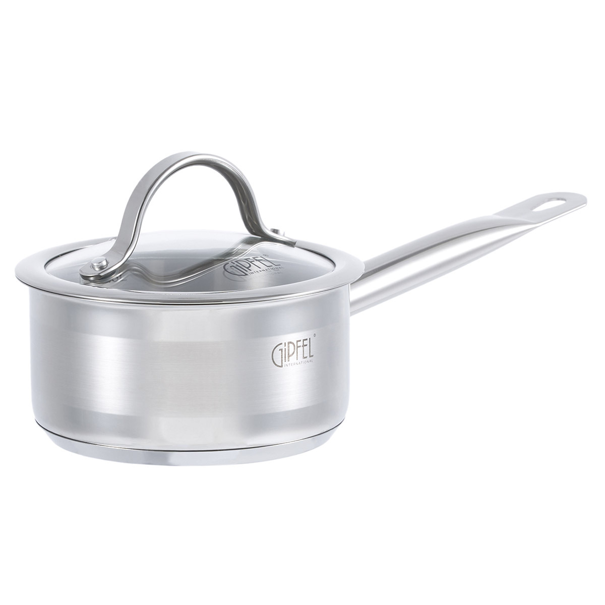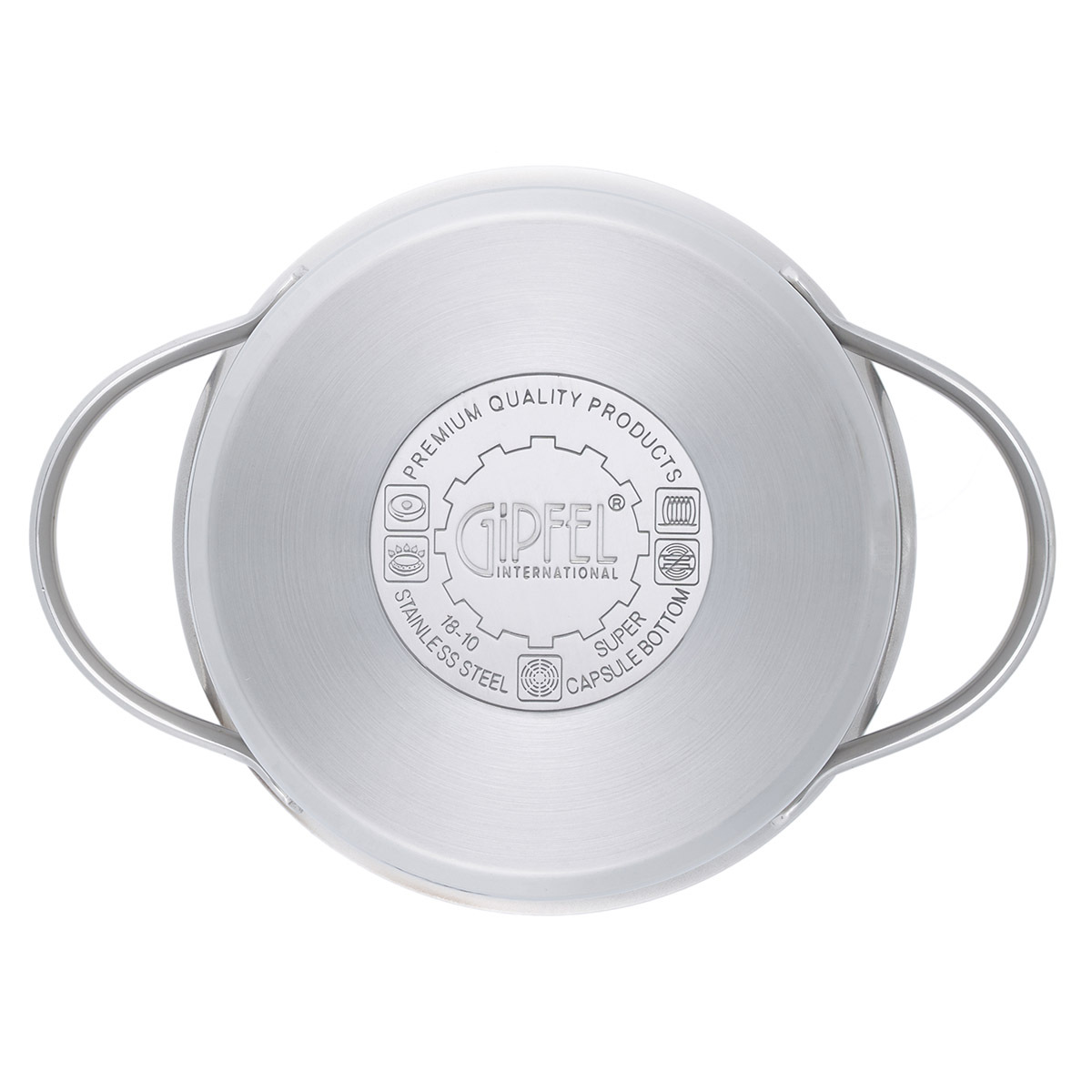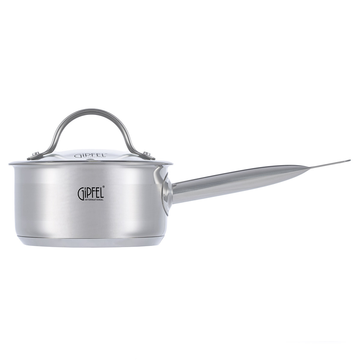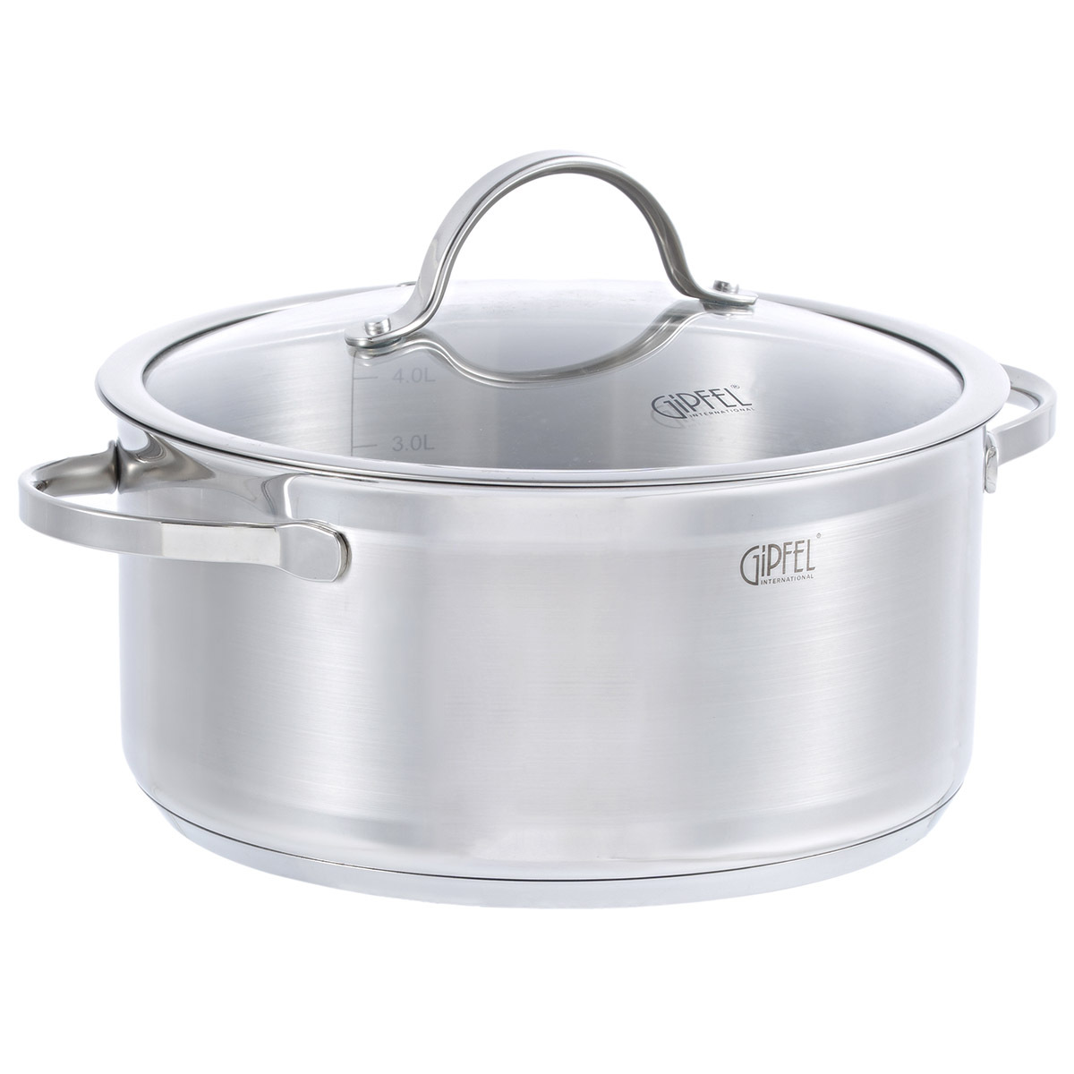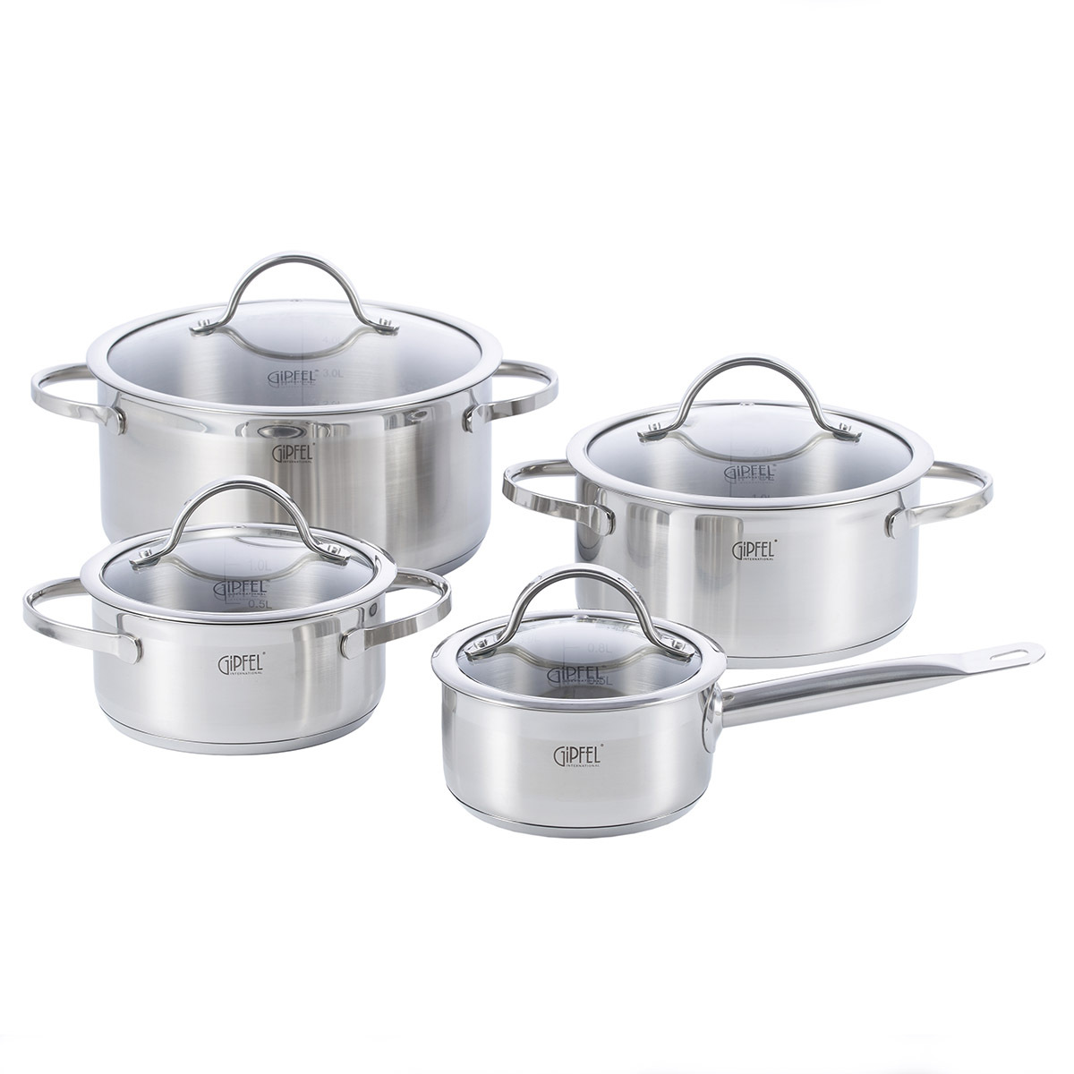 Набор посуды из нержавеющей стали Gipfel Victory 1551. В комплекте: ковш 14х7см/0,9 л, кастрюли 16х7,5см/1,3 л, 20х9,5см/2,6 л, 24х11,5см/4,7 л со стеклянными крышками и индукционным капсульным дном. Материал: нержавеющая сталь 18/10. Толщина стенок 0,6 мм, толщина дна 4,1 мм.