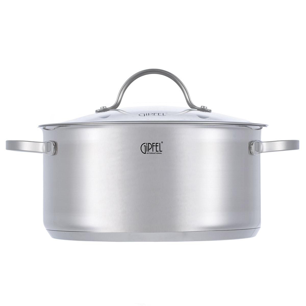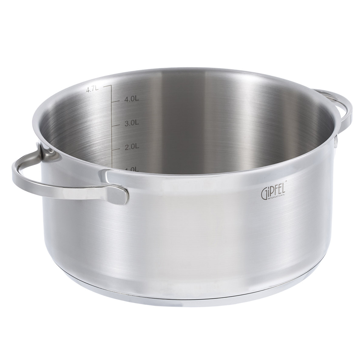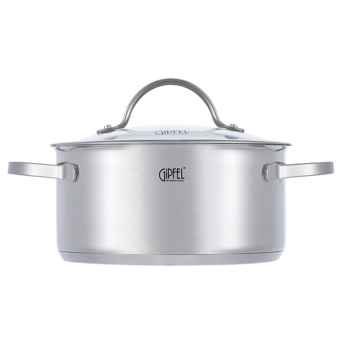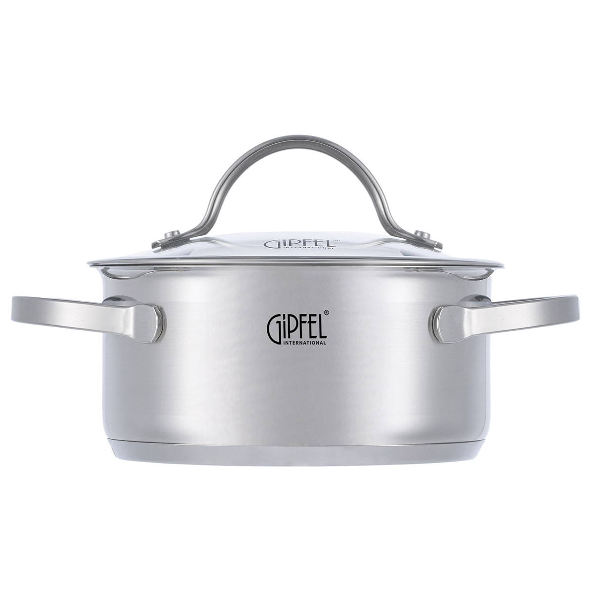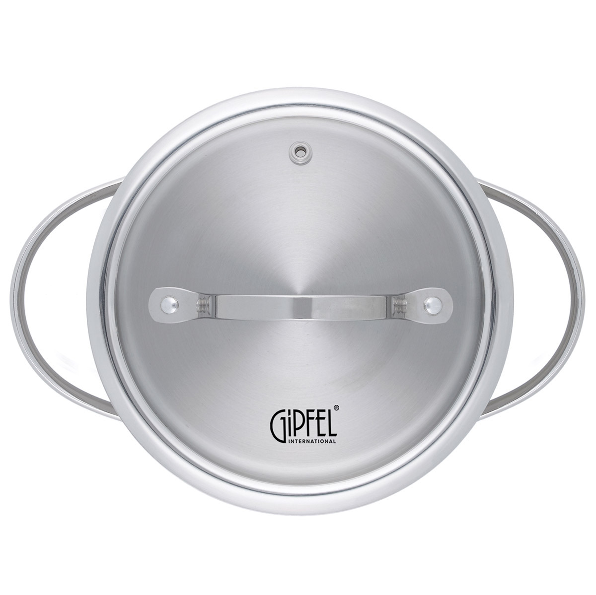 Набор посуды из нержавеющей стали Gipfel Victory 1551. В комплекте: ковш 14х7см/0,9 л, кастрюли 16х7,5см/1,3 л, 20х9,5см/2,6 л, 24х11,5см/4,7 л со стеклянными крышками и индукционным капсульным дном. Материал: нержавеющая сталь 18/10. Толщина стенок 0,6 мм, толщина дна 4,1 мм.