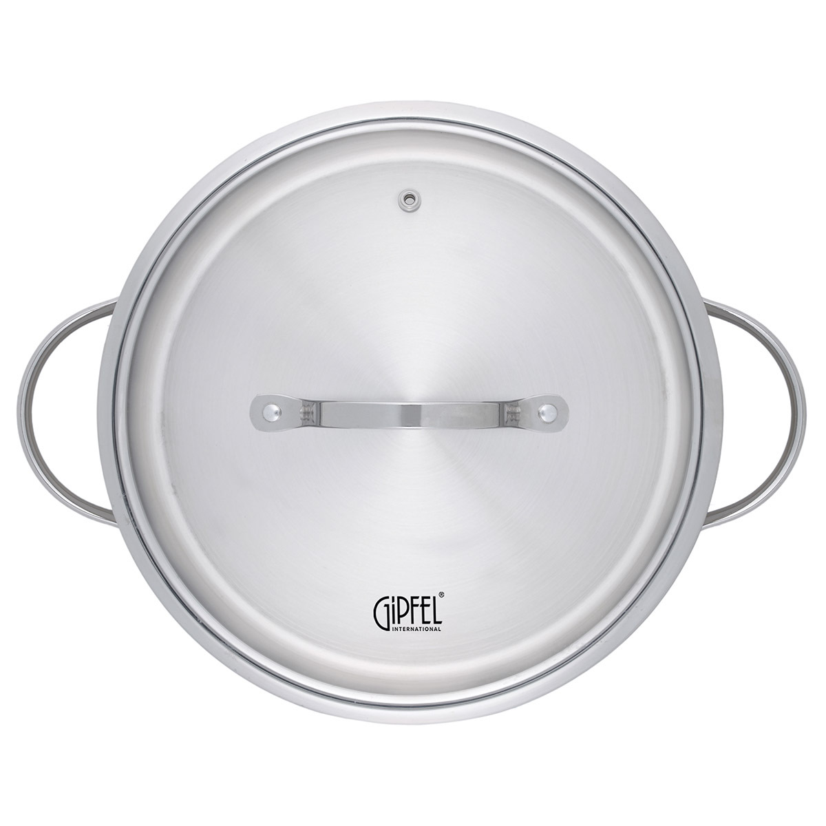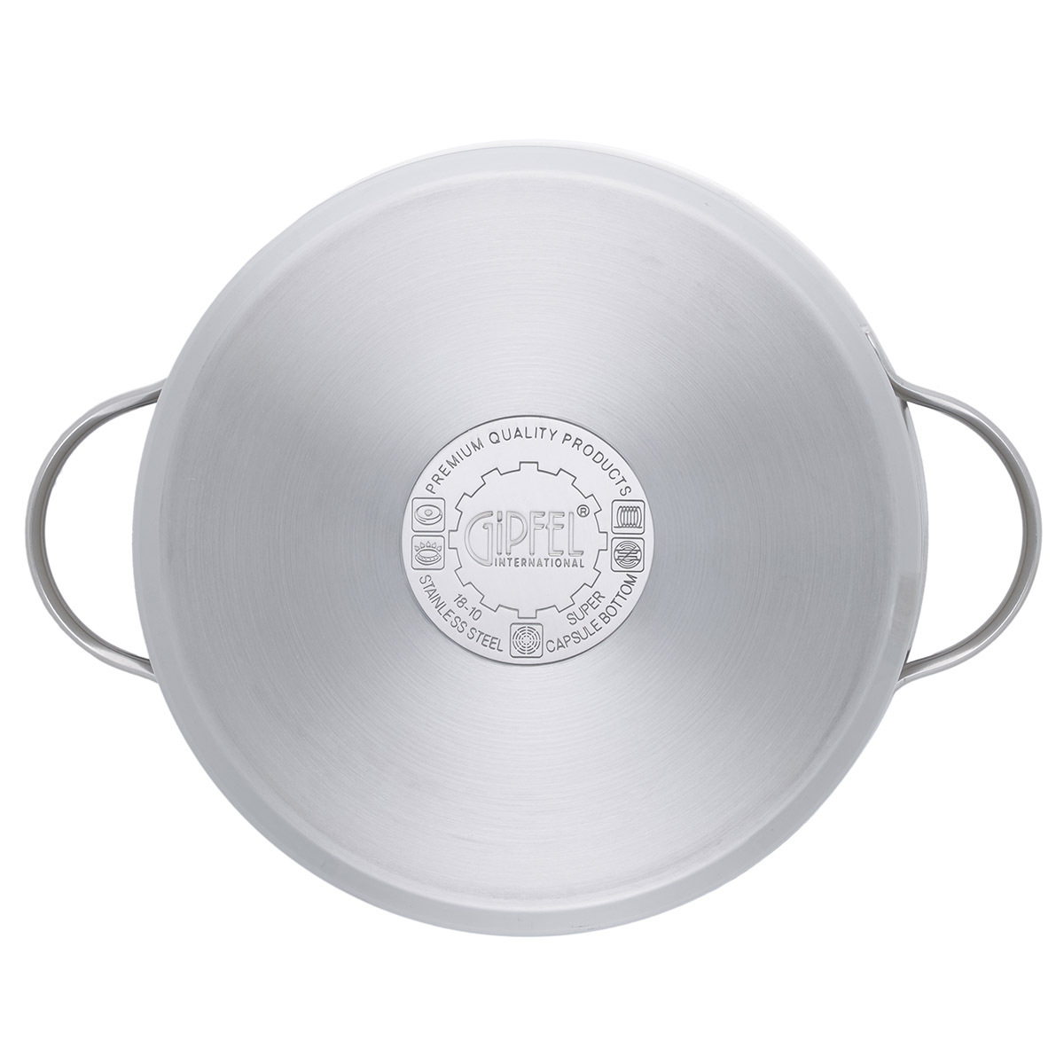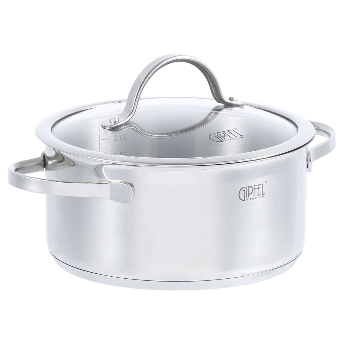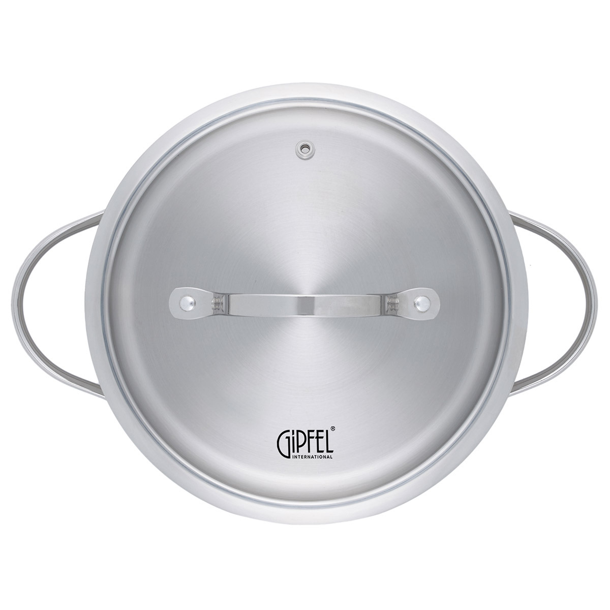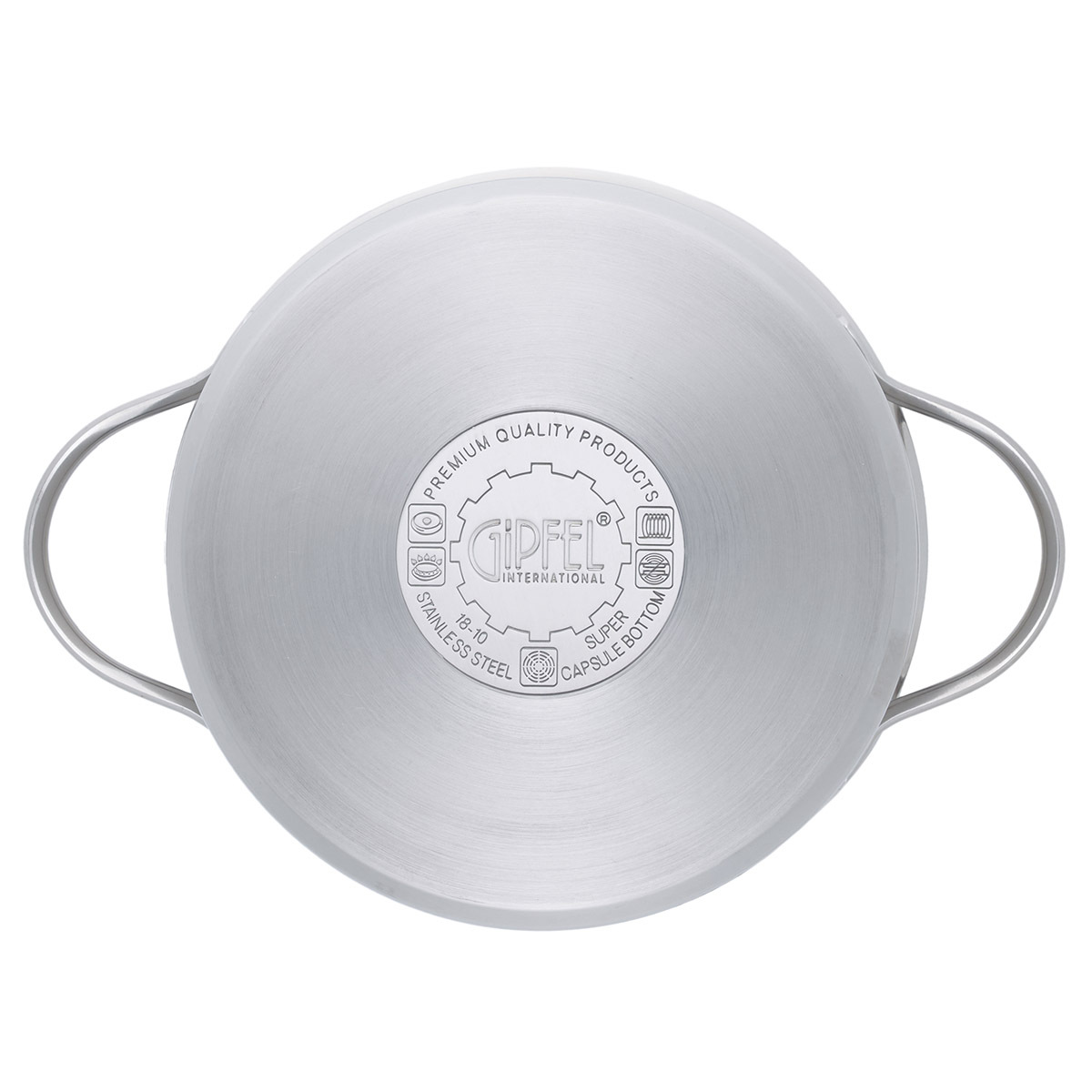 Набор посуды из нержавеющей стали Gipfel Victory 1551. В комплекте: ковш 14х7см/0,9 л, кастрюли 16х7,5см/1,3 л, 20х9,5см/2,6 л, 24х11,5см/4,7 л со стеклянными крышками и индукционным капсульным дном. Материал: нержавеющая сталь 18/10. Толщина стенок 0,6 мм, толщина дна 4,1 мм.