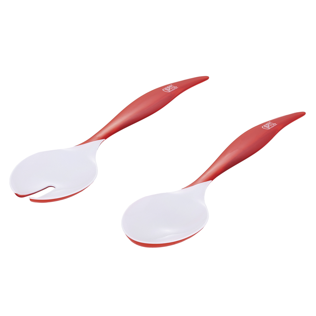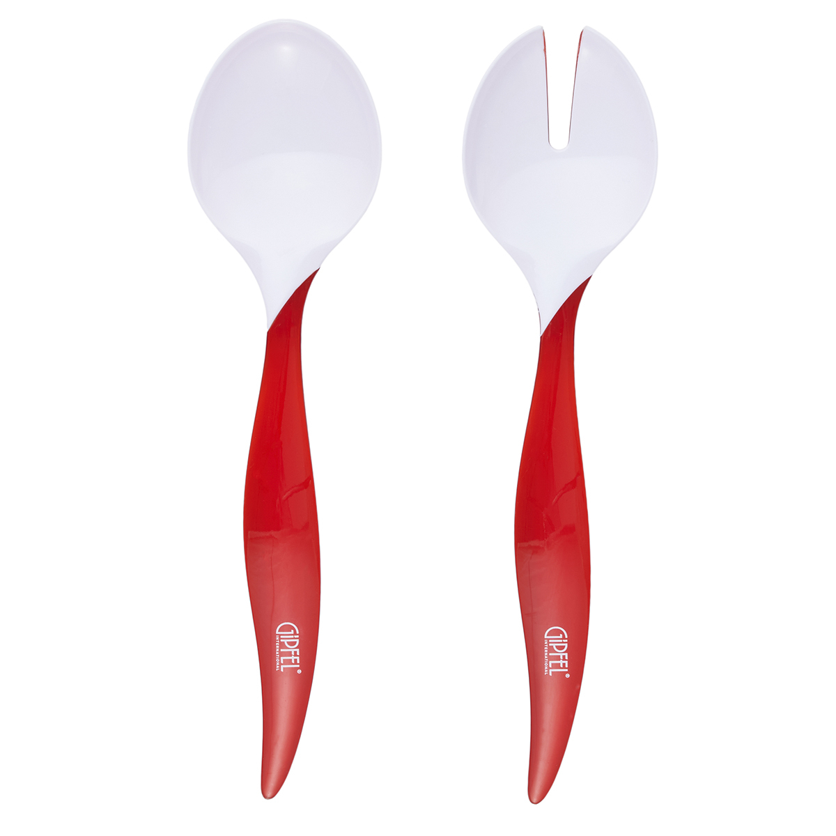 Набор для салата Gipfel LUMINO 9483. В наборе 2 предмета: салатная ложка и салатная вилка. Длина приборов 30 см. Приборы сделаны из пластика и имеют красные ручки в форме листа.