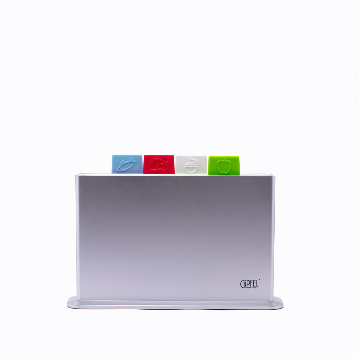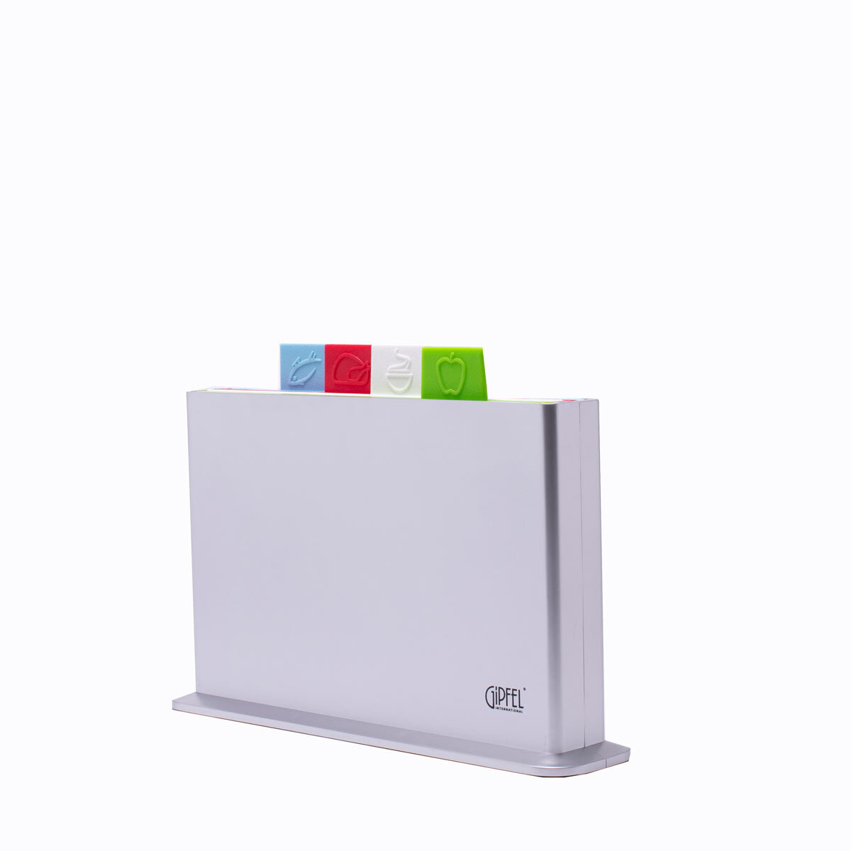Набор разделочных досок Gipfel Corta 3137. В наборе 4 разделочных доски и подставка для них. Сделаны из пищевого пластика. Размер рабочей поверхности каждой доски 29х19,5см. Размер набора 30х8х24см. На ярлычках досок для удобства нарисованы продукты, для которых рекомендуется их использовать, так доски не будут передавать посторонние запахи различным продуктам. Доски также различаются по цветам, каждый цвет можно использовать для определенной пищи: рыбы, мяса, фруктов, овощей.