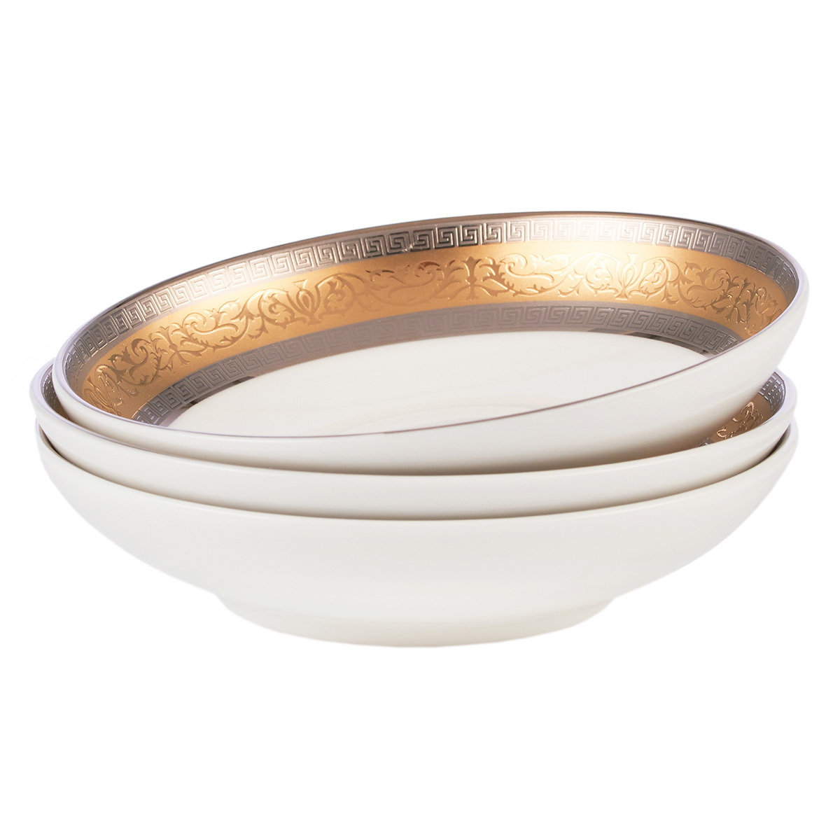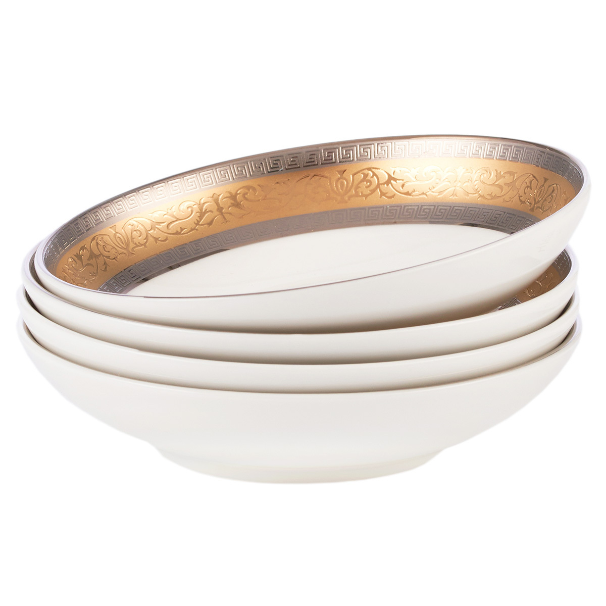 Набор розеток Gipfel Hermes 41475. В наборе 4 розетки из костяного фарфора с золотым и серебряным кантом. Объем одной розетки 50 мл, размер 10,5x2,5 см, вес 76 гр.