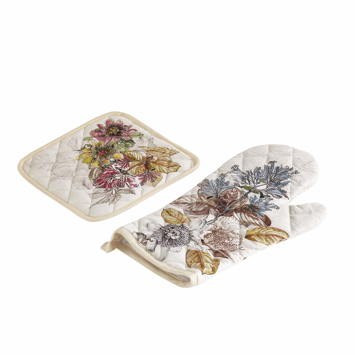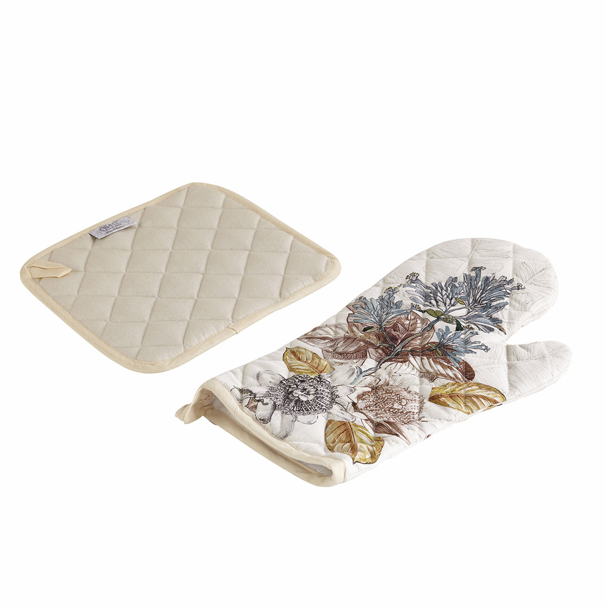 Комплект Gipfel ELEGIA 41005. Набор из рукавицы и квадратной прихватки в рустикальном стиле с мелким цветочным рисунком. Прихватка-рукавица размером 33х21 см, прихватка размером 22х22 см. Сделаны из 100% хлопка с грязеотталкивающим покрытием.