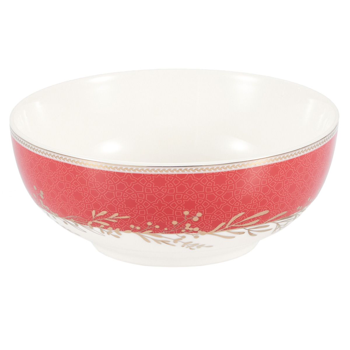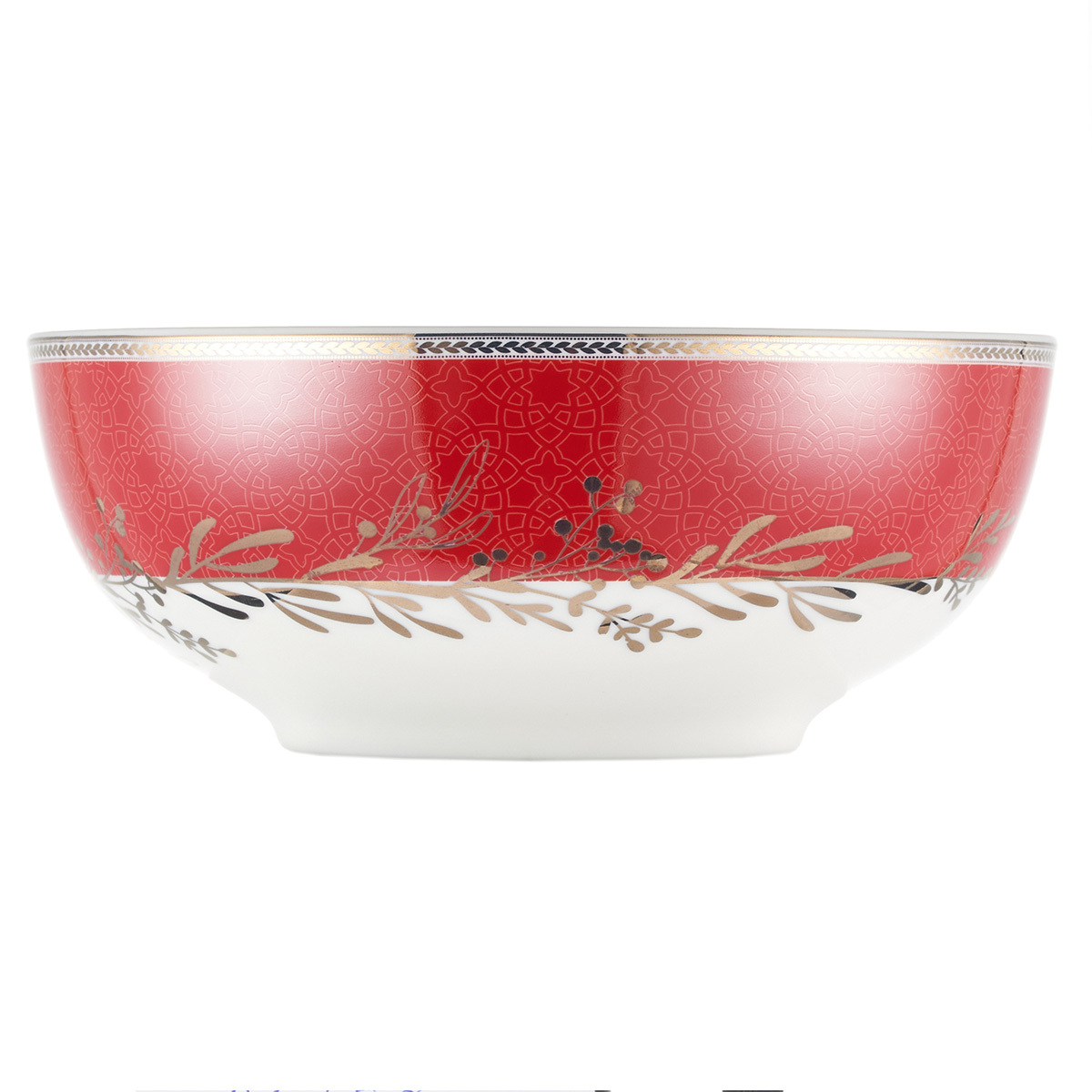 Благодаря контрастному сочетанию белого и красного цветов, очаровательному золотистому кружевному и растительному узорам, посуда смотрится необыкновенно нарядно и создает особую праздничную атмосферу. Такая посуда украсит Новогодний стол и любой другой праздник.