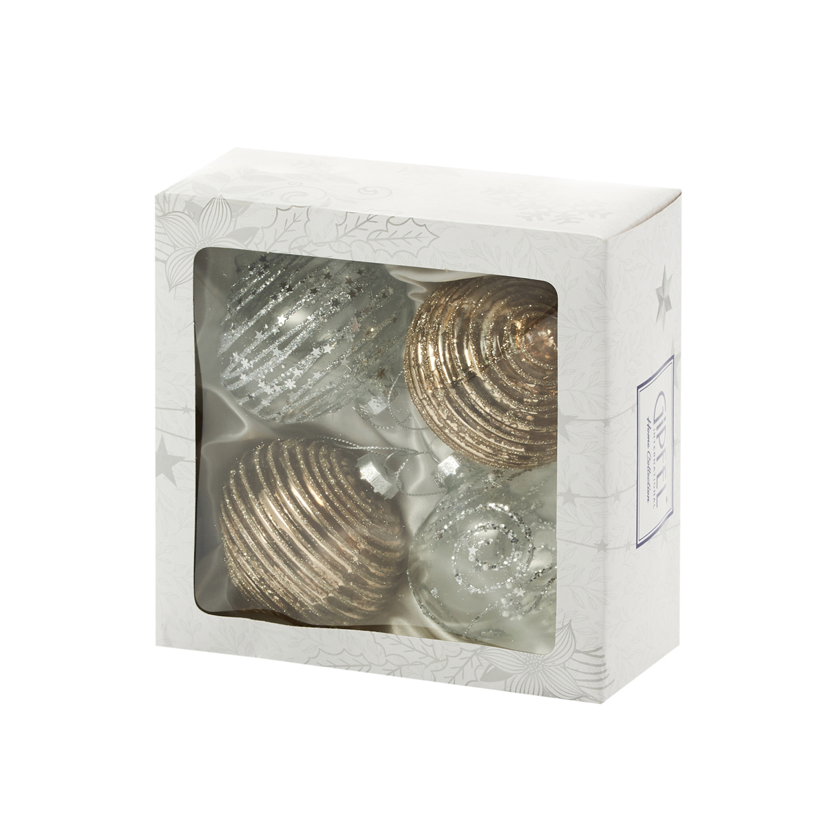 Набор новогодних шаров GIPFEL CHRISTMAS TOYS 41426 4 шт. Диаметр 8 см. В наборе 4 шара: 2 прозрачных с серебряным декором, 2 с золотым декором. Они нарядно смотрятся на новогодней елке и сверкают в свете гирлянды. Сделаны из стекла.