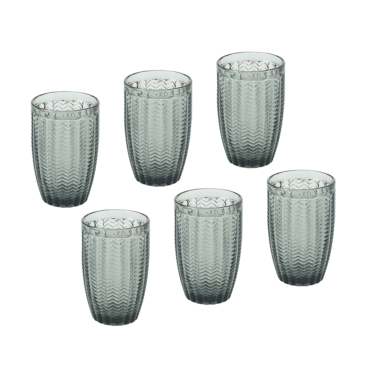 Набор стаканов для напитков Gipfel GREY WAVE 4127. В наборе 6 бокалов из толстого серого стекла с рифленой поверхностью. Размер бокалов 8,3x13 cм.