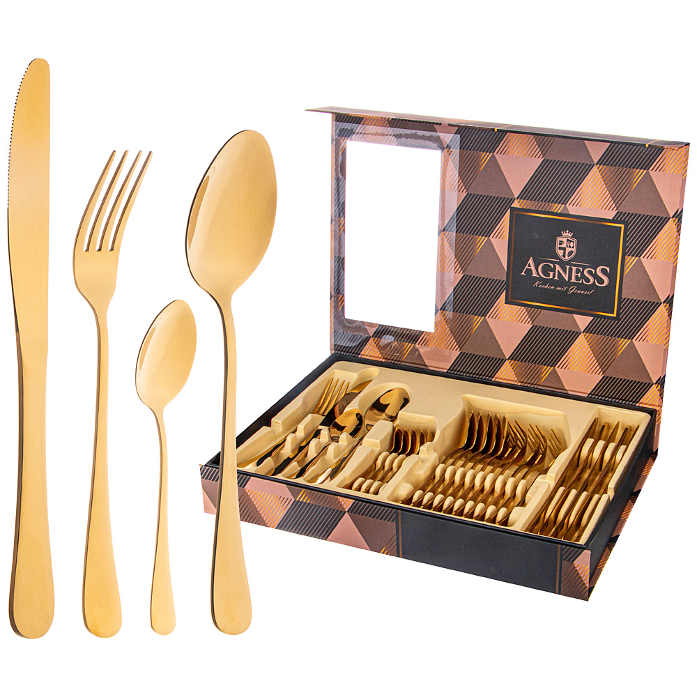 Набор столовых приборов AGNESS не только прекрасно выглядит, но и обладает отличной функциональностью. Вилки и ложки имеют комфортные ручки, которые удобно держать в руке. Каждый предмет выполнен из нержавеющей стали 18/10, что обеспечивает долговечность и устойчивость к коррозии. Острые лезвия ножей с зубчиками позволяют легко нарезать пищу. Набор столовых приборов является отличным выбором для кухни, где они могут быть использованы в повседневной жизни или во время особых событий и праздников. Они также подходят для ресторанов и кафе, добавляя шарма и элегантности к сервировке стола. Благодаря своей прочности и изысканному дизайну, этот набор столовых приборов станет вашим надежным и стильным спутником на многие годы.Чтобы приборы прослужили долго необходимо соблюдать ряд правил по уходу: использовать мягкие материалы, щадящие моющие эко вещества, замачивать застарелые пятна, исключая механическое воздействие. Запрещается использовать абразивные и хлоросодержащие средства.