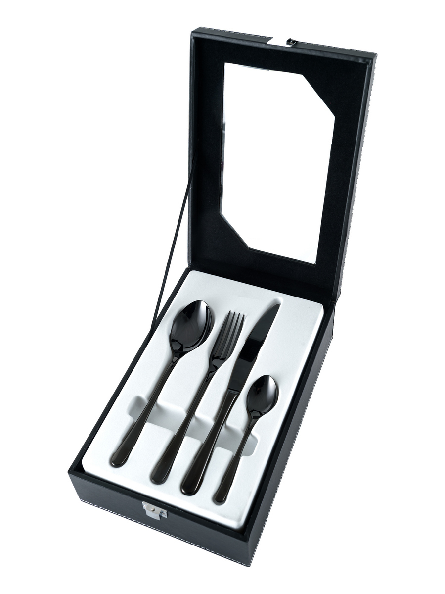 Элегантный подарочный набор столовых приборов Gipfel, включающий 24 предмета, упакован в кожаный футляр. Набор станет презентом для кухни. Ложки, вилки и ножи изготовлены из прочной нержавеющей стали 18/10. Изделия выполнены в черном цвете и покрыты специальным PVD-вакуумным напылением, которое дополнительно защищает материал от коррозии и экологически безопасно.