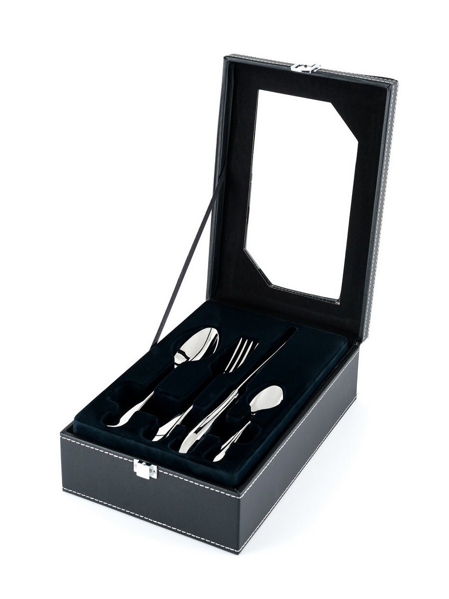 В набор столовых приборов Gipfel входит 24 предмета: 6 чайных ложек, 6 столовых ложек, 6 вилок и 6 ножей. Предметы изготовлены из стали, обладающей нержавеющими свойствами. Материал повышенной прочности безопасен для здоровья. Изделия из нержавеющей стали прослужат длительное время без потери внешнего вида. Набор упакован в черную подарочную упаковку.