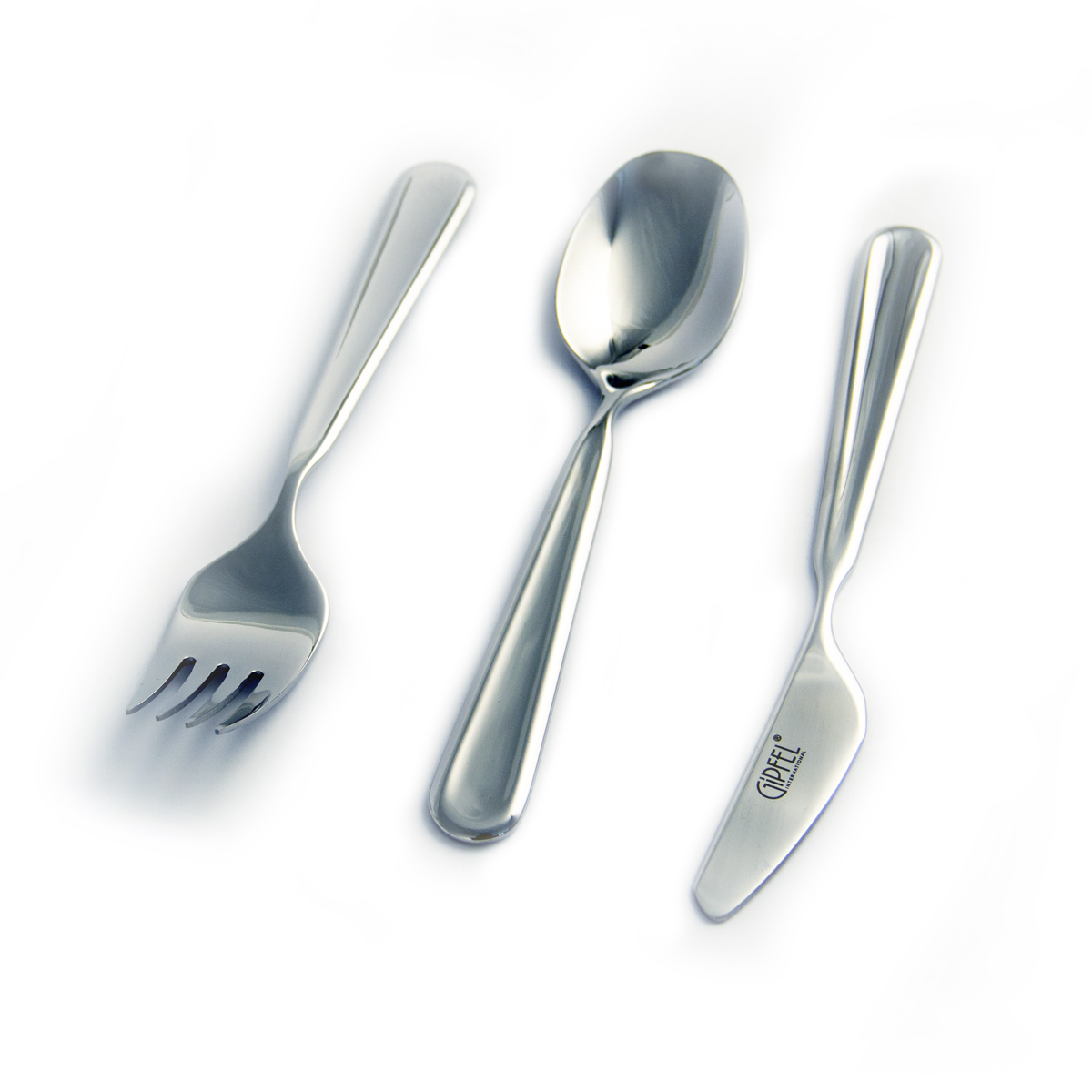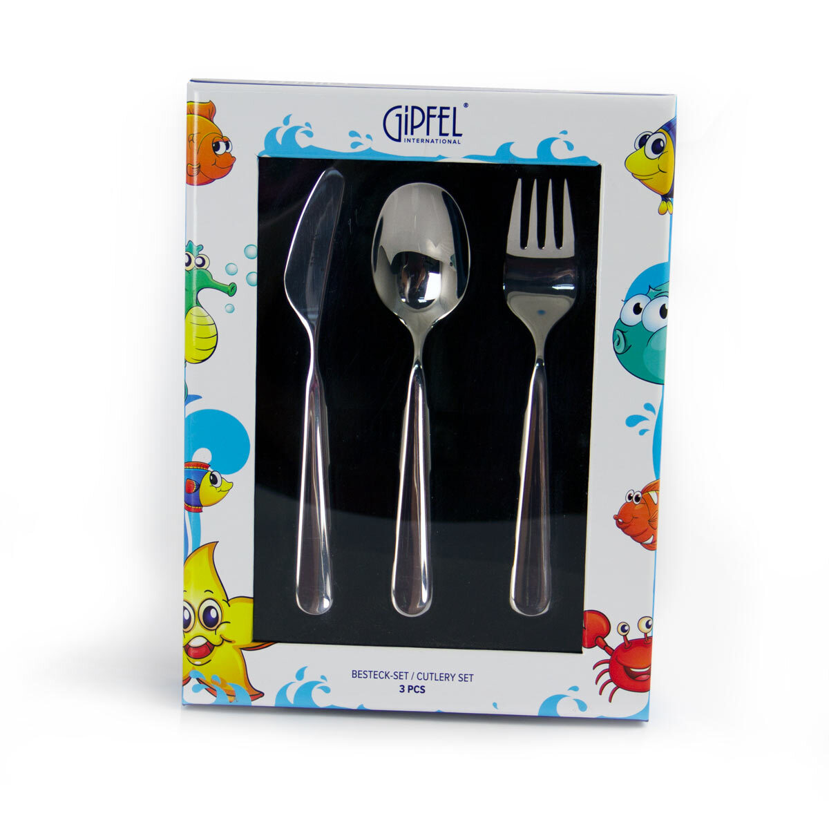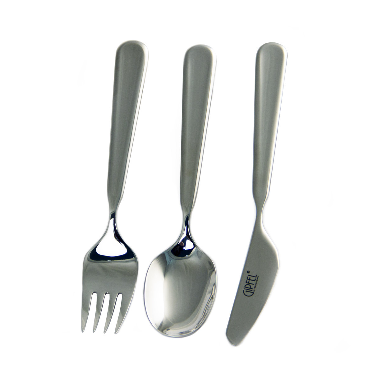 Набор столовых приборов Gipfel 8639 из 3 предметов для детей. В набор входят нож 15,4 см, вилка 14,9 см, ложка 14,8 см. Материал: нержавеющая сталь 18/10. Упакован в красочную коробку.