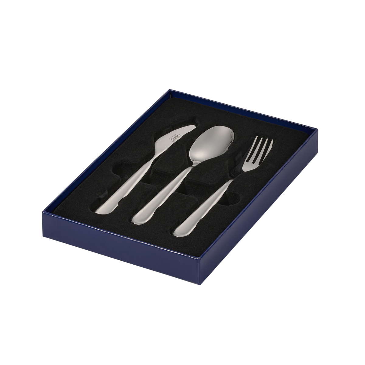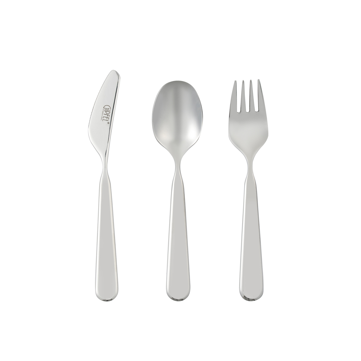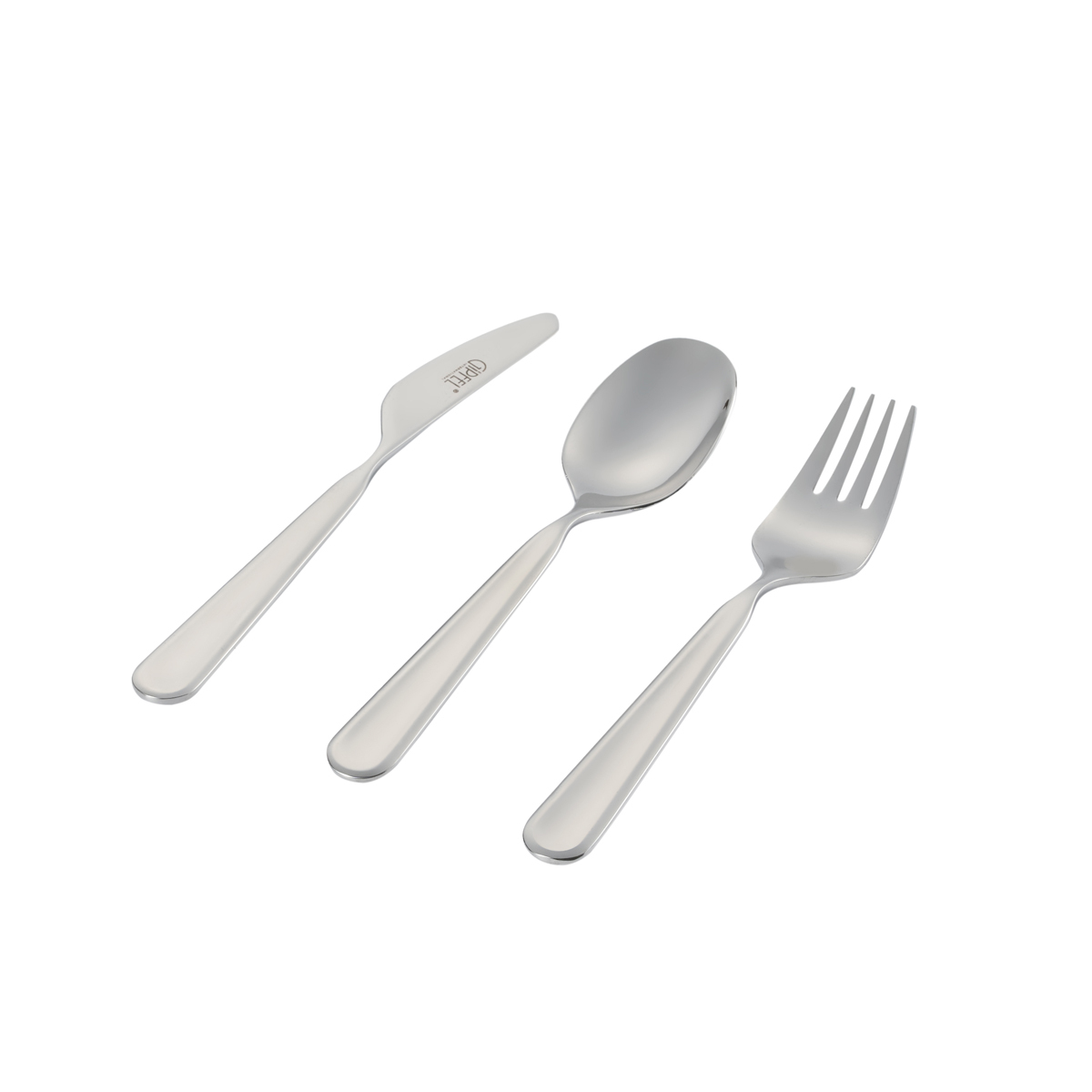 Набор столовых приборов Gipfel 8639 из 3 предметов для детей. В набор входят нож 15,4 см, вилка 14,9 см, ложка 14,8 см. Материал: нержавеющая сталь 18/10. Упакован в красочную коробку.
