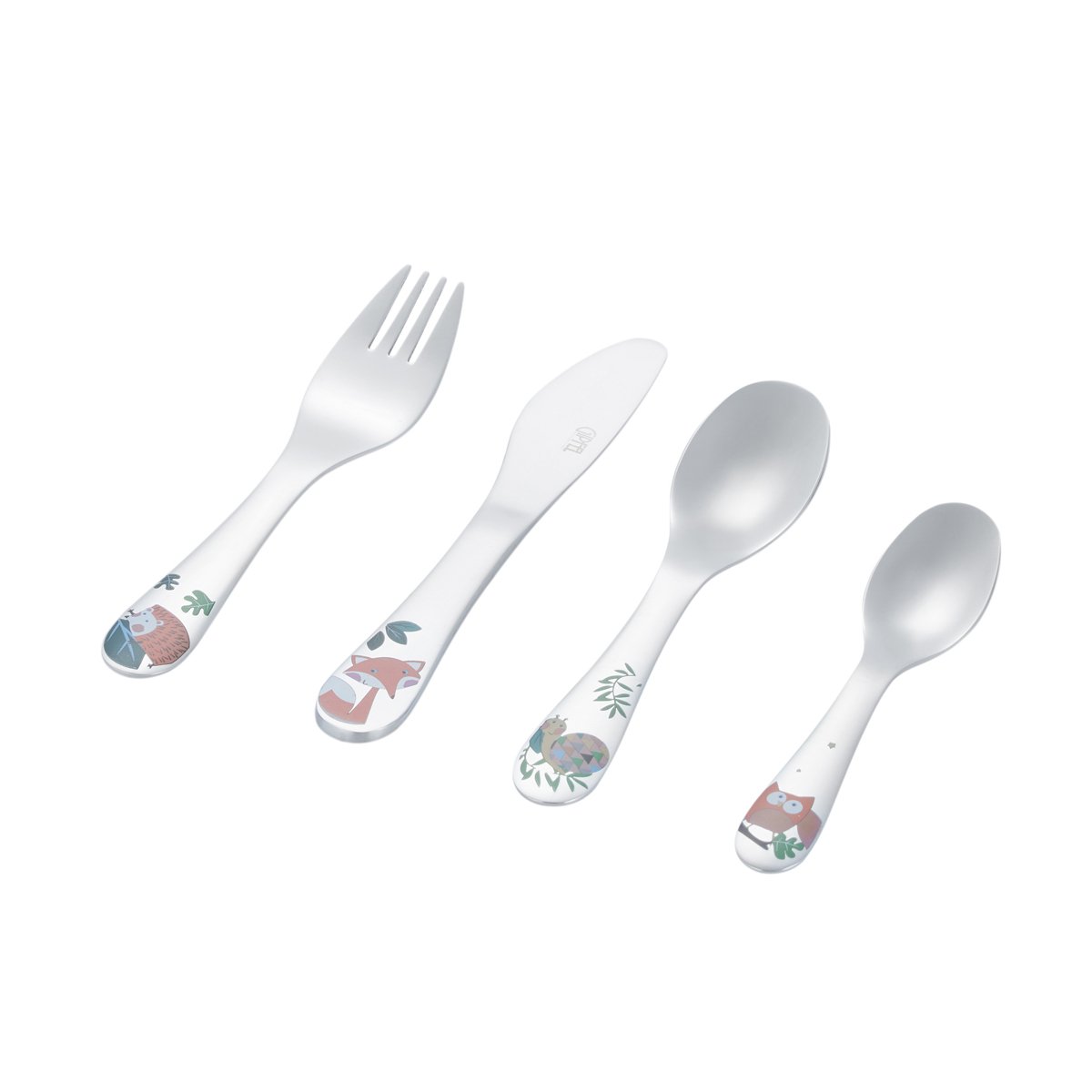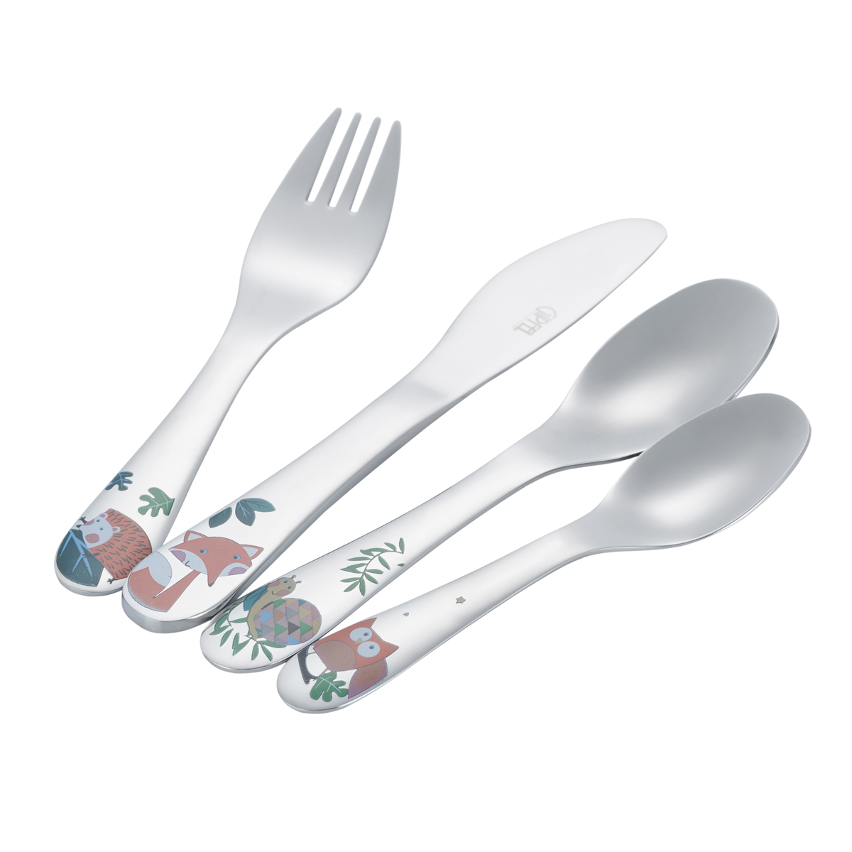 Набор столовых приборов Gipfel FUNNY FOREST 50693 из 4 предметов. В набор входят: нож 17 см, вилка 16 см, ложка 16 см, чайная ложка 13 см. Набор выполнен из нержавеющей стали 18/10.