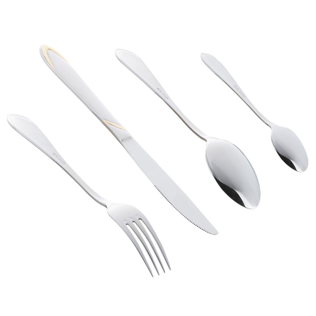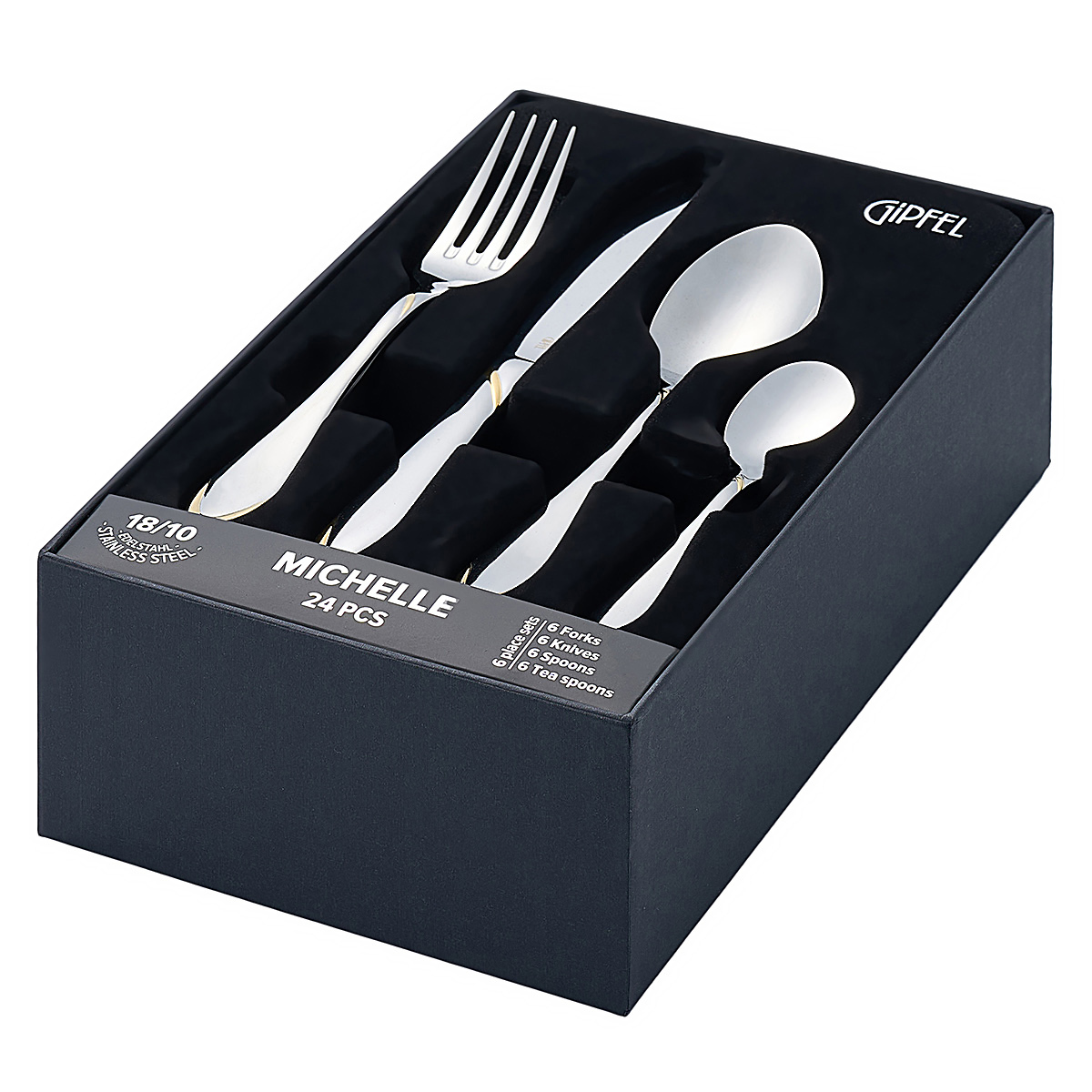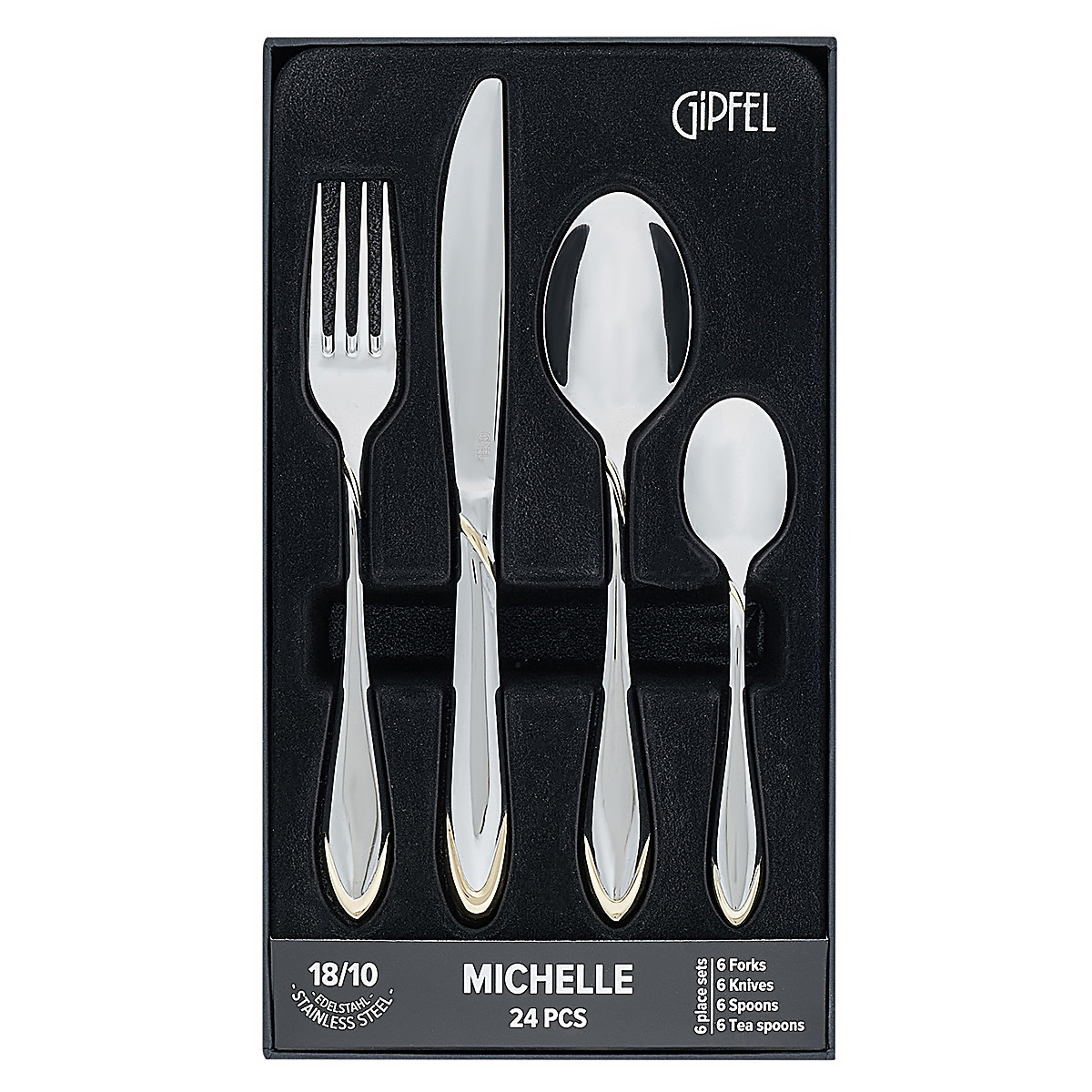 Набор столовых приборов Gipfel Michelle 51237. В наборе 24 предмета на 6 персон: 6 столовых ложек, 6 чайных ложек, 6 вилок и 6 столовых ножей. Предметы изготовлены из нержавеющей стали 18/10 и имеют зеркальную полировку.