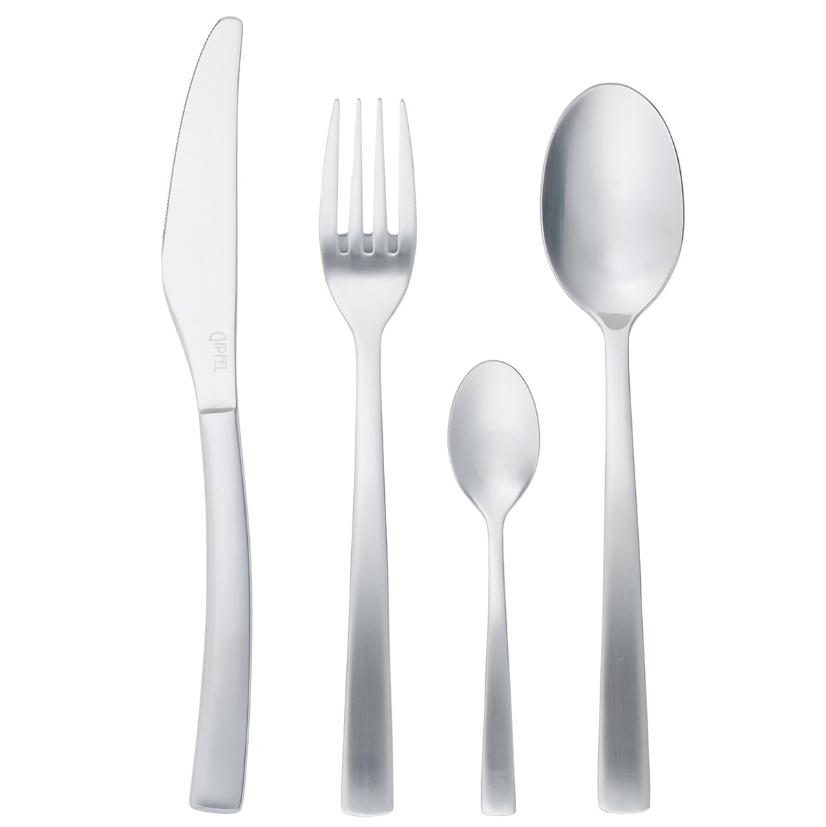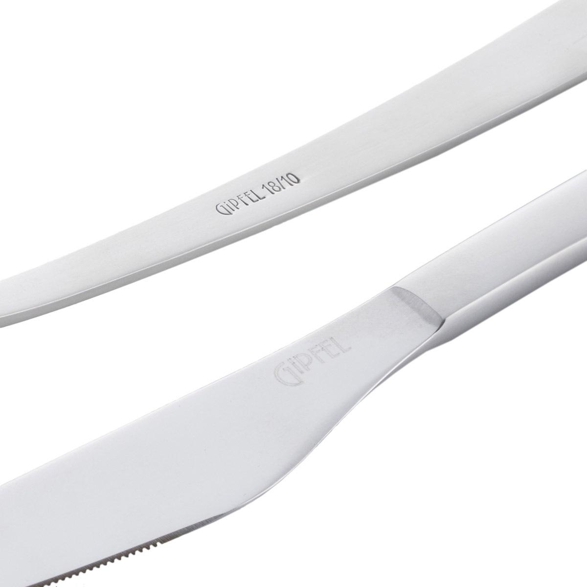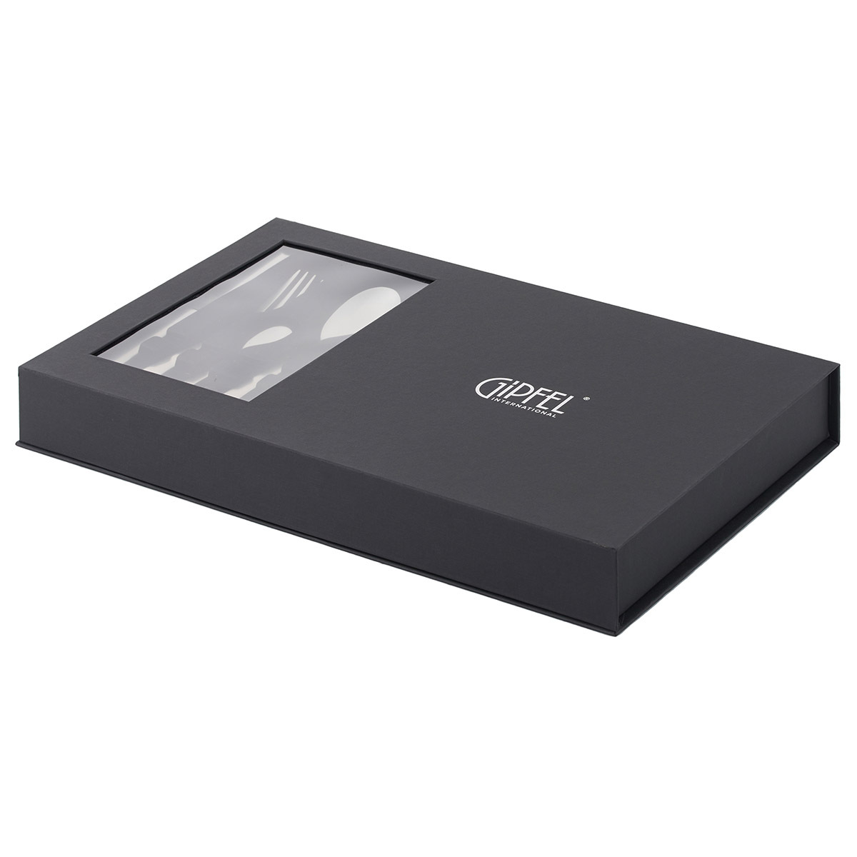 Набор столовых приборов Gipfel Rioma 51238. В наборе 24 предмета на 6 персон. В состав набора входят 6 столовых ложек, 6 чайных ложек, 6 вилок и 6 столовых ножей. Предметы изготовлены из нержавеющей стали 18/10 и имеют матовую полировку. Упакованы в подарочную черную коробку.