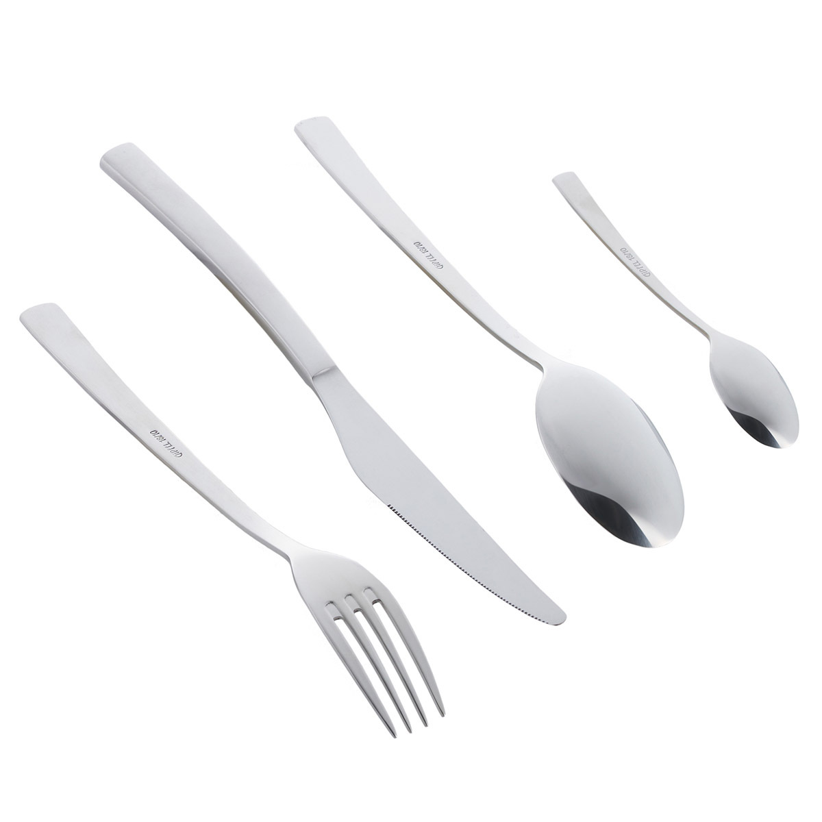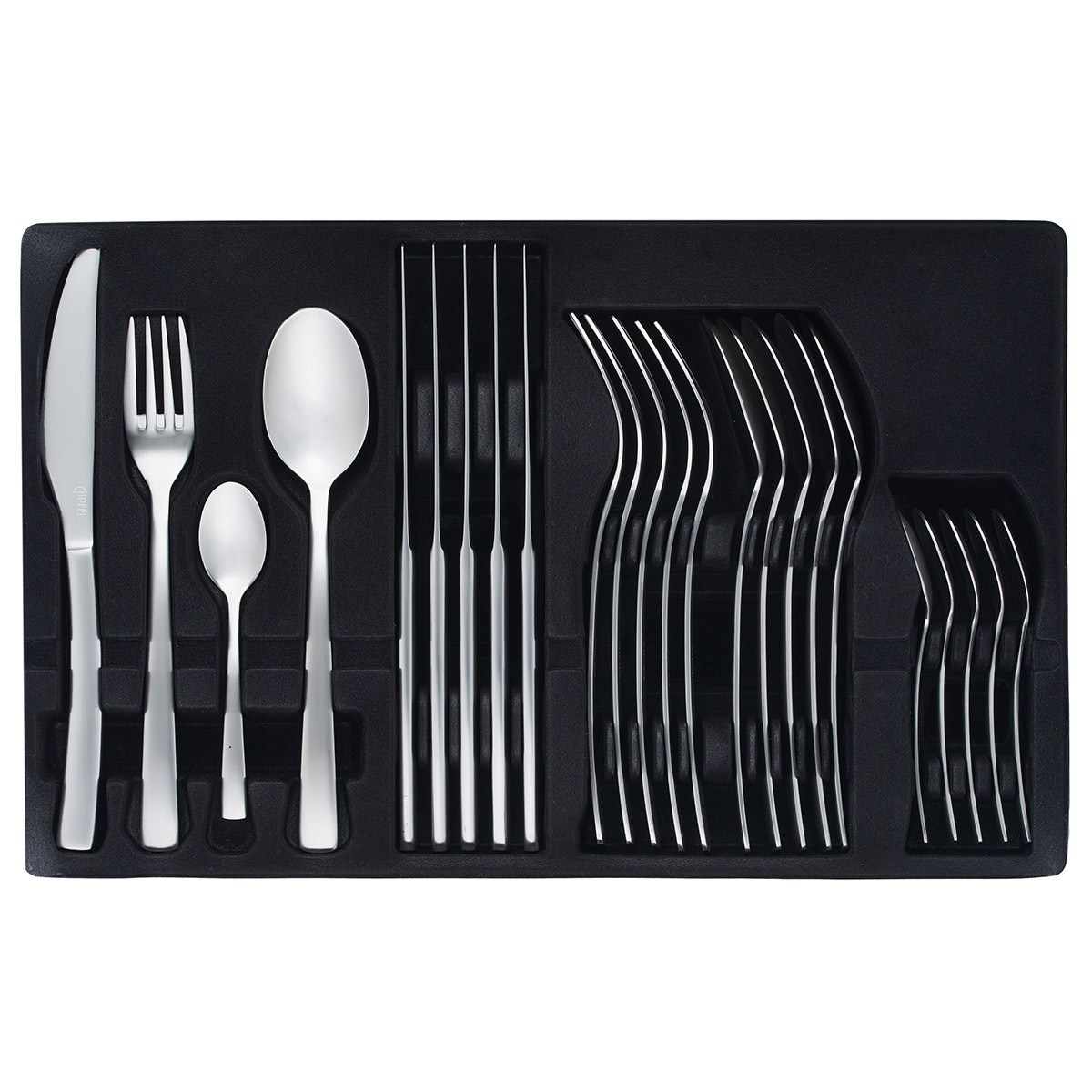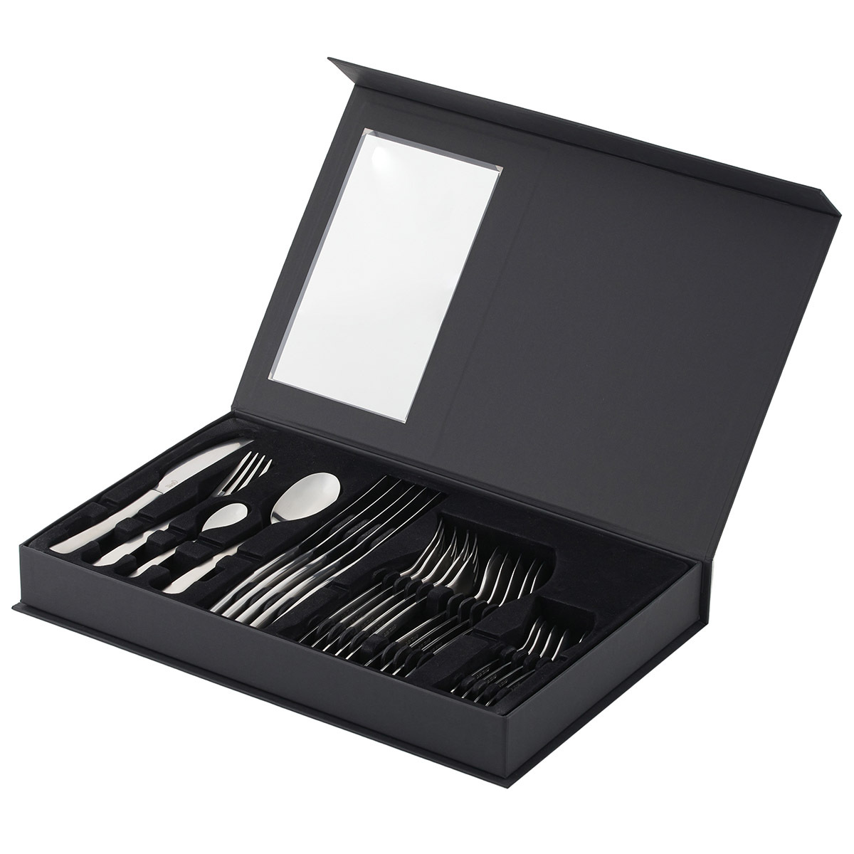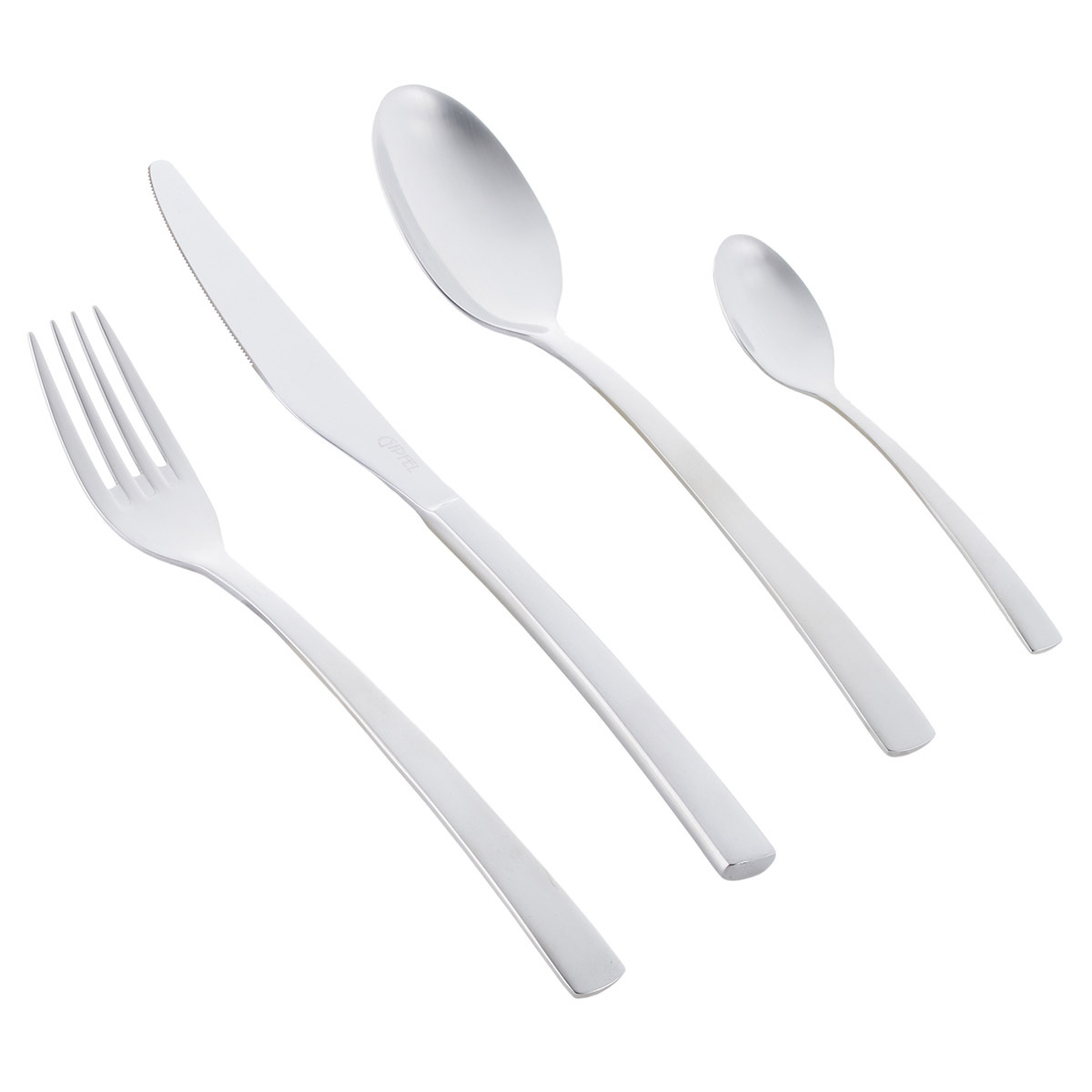 Набор столовых приборов Gipfel Rioma 51238. В наборе 24 предмета на 6 персон. В состав набора входят 6 столовых ложек, 6 чайных ложек, 6 вилок и 6 столовых ножей. Предметы изготовлены из нержавеющей стали 18/10 и имеют матовую полировку. Упакованы в подарочную черную коробку.