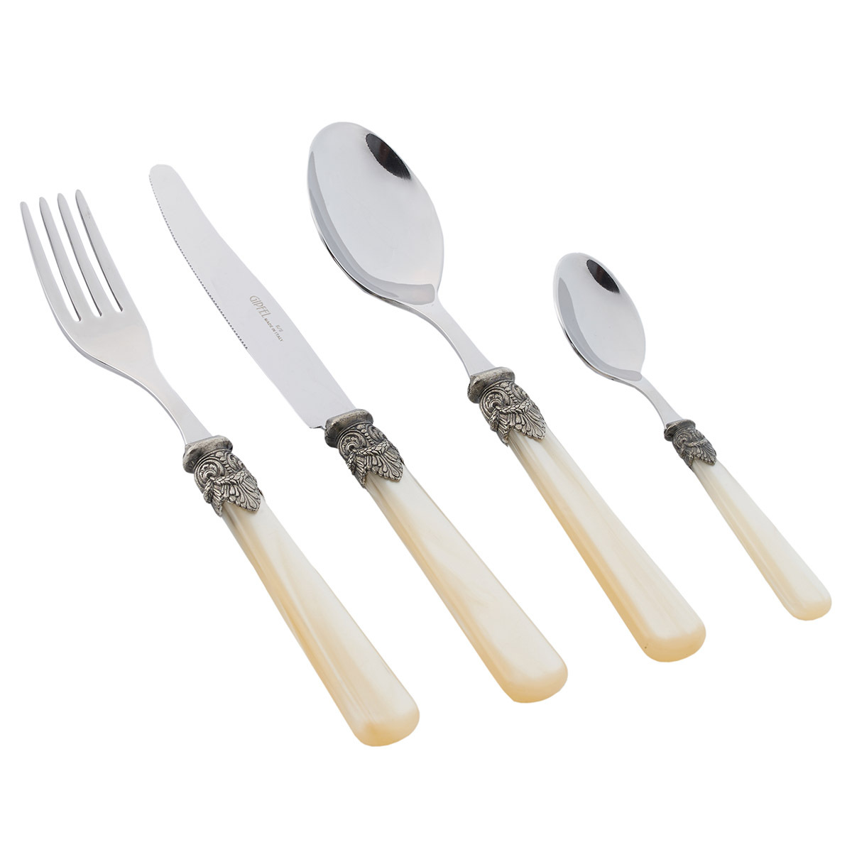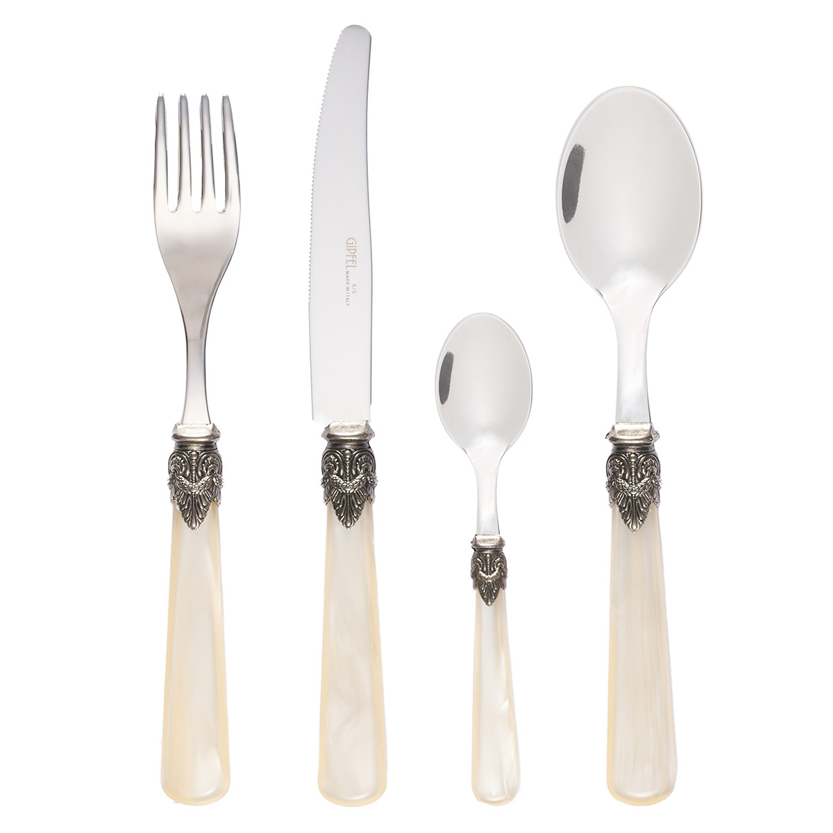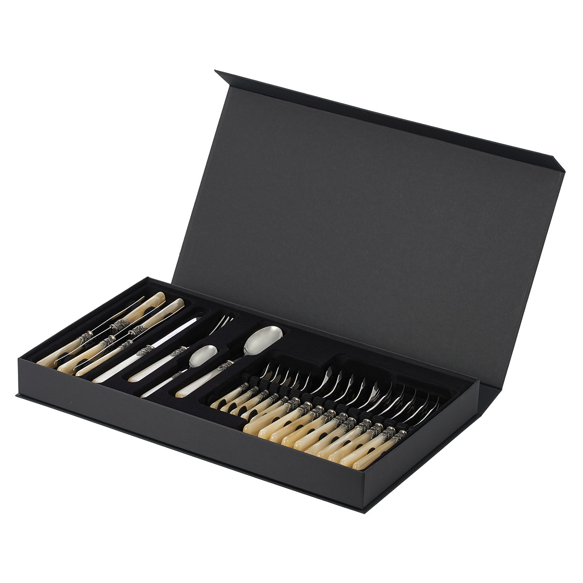 Набор из 24 предметов, в который входят 6 чайных и столовых ложек, 6 вилок и 6 столовых ножей. Все столовые приборы, входящие в набор, изготовлены из высококачественной нержавеющей стали марки 18/10, отличающейся особой прочностью и долговечностью. Ручки приборов выполнены в светло-золотистом цвете из прочного метакрила. Набор упакован в практичный пластиковый короб белого цвета.