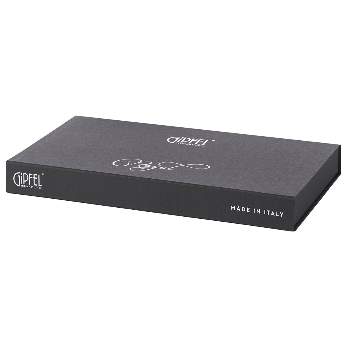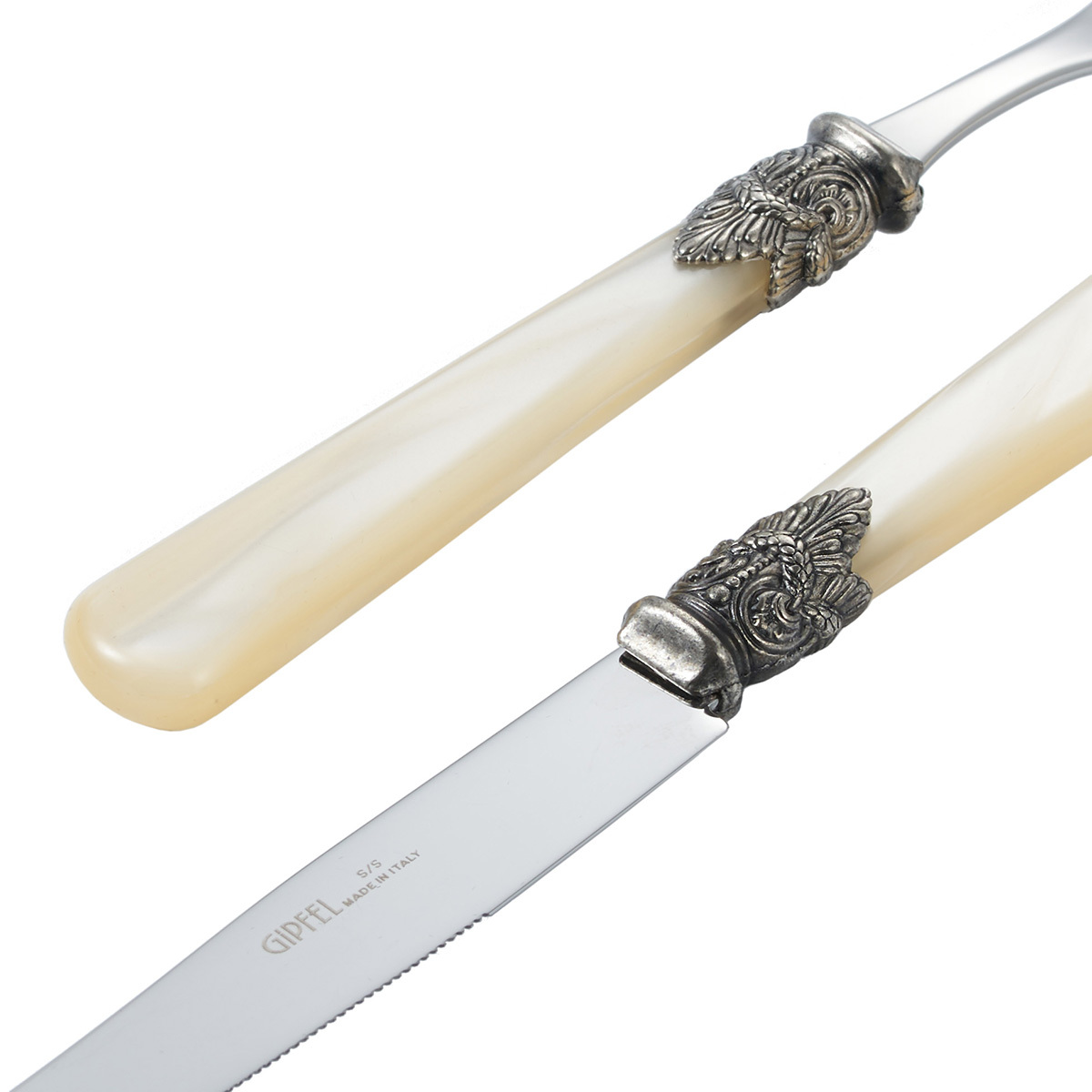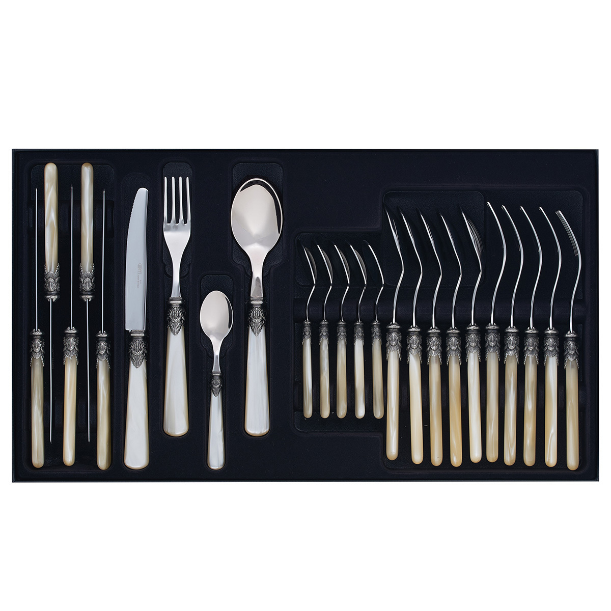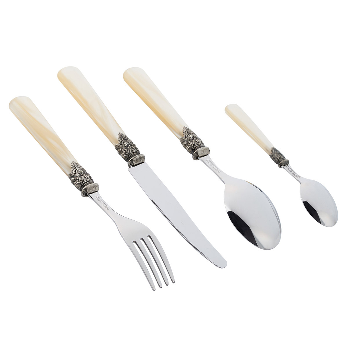 Набор из 24 предметов, в который входят 6 чайных и столовых ложек, 6 вилок и 6 столовых ножей. Все столовые приборы, входящие в набор, изготовлены из высококачественной нержавеющей стали марки 18/10, отличающейся особой прочностью и долговечностью. Ручки приборов выполнены в светло-золотистом цвете из прочного метакрила. Набор упакован в практичный пластиковый короб белого цвета.
