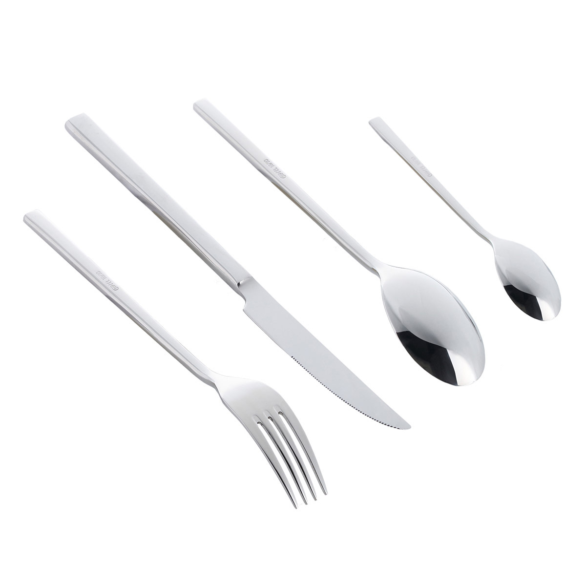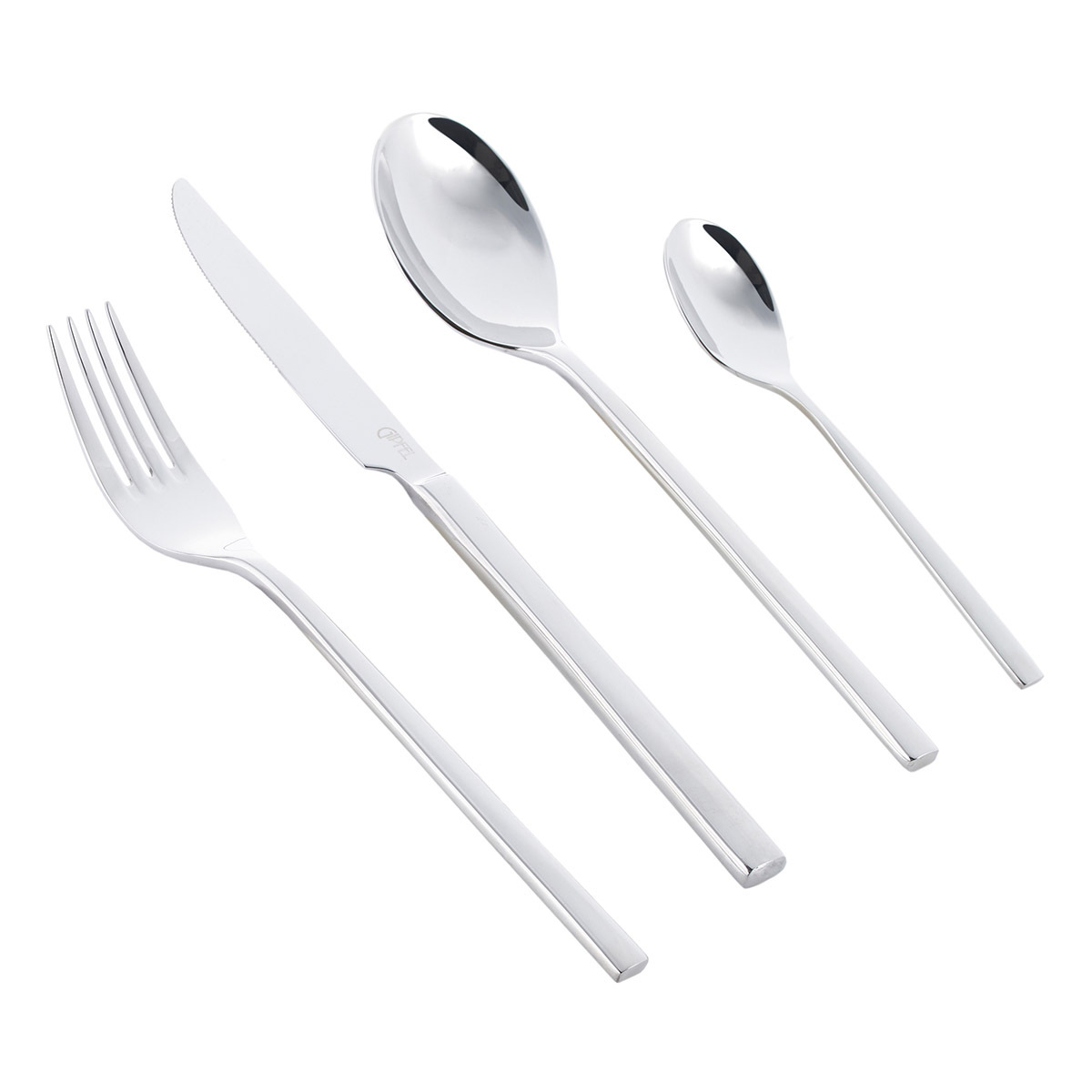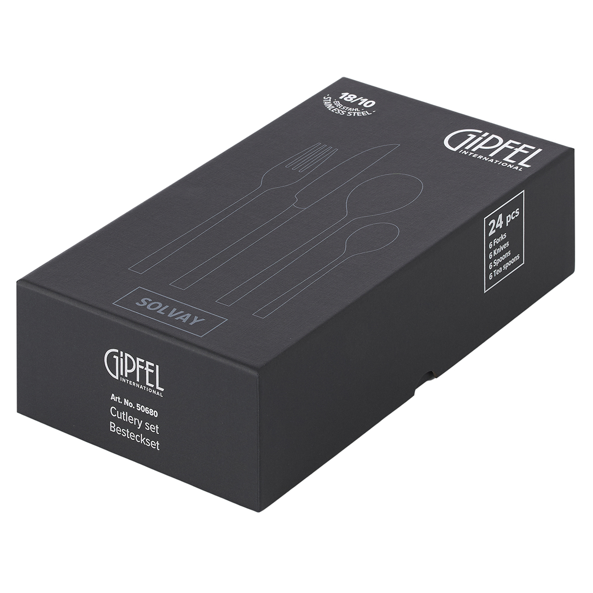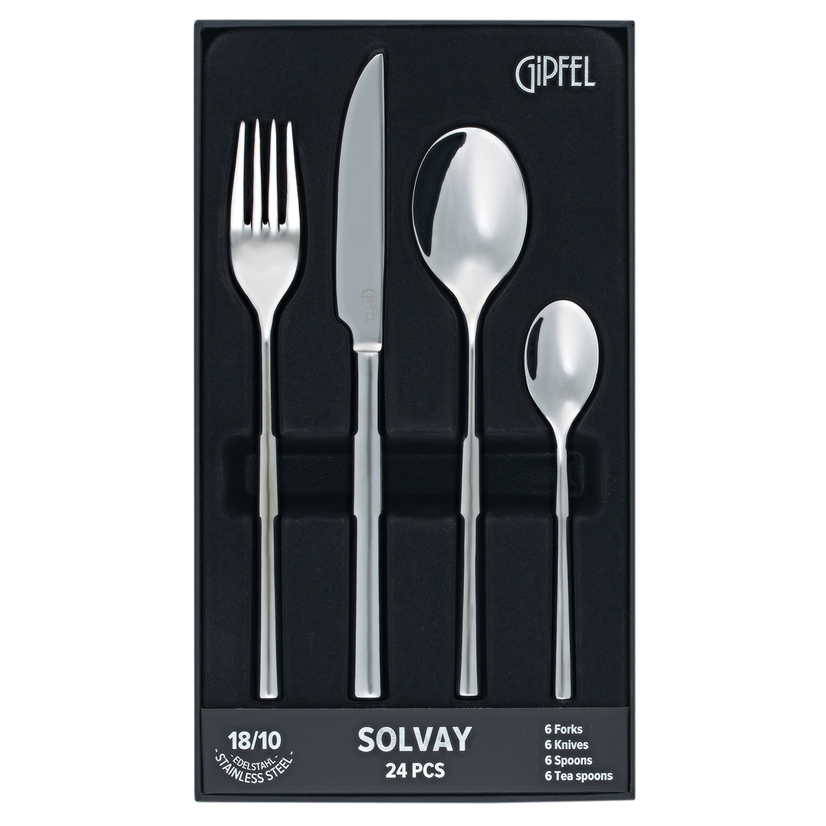 Набор столовых приборов Gipfel Solvay 50680. В наборе 24 предмета на 6 персон: 6 столовых ложек, 6 чайных ложек, 6 вилок и 6 столовых ножей. Предметы изготовлены из нержавеющей стали 18/10 и имеют зеркальную полировку.