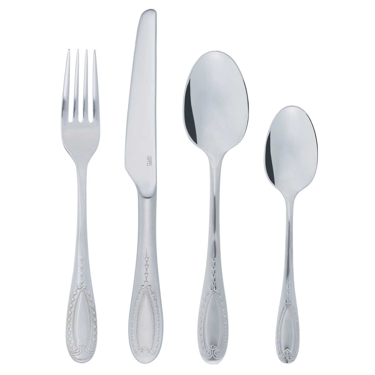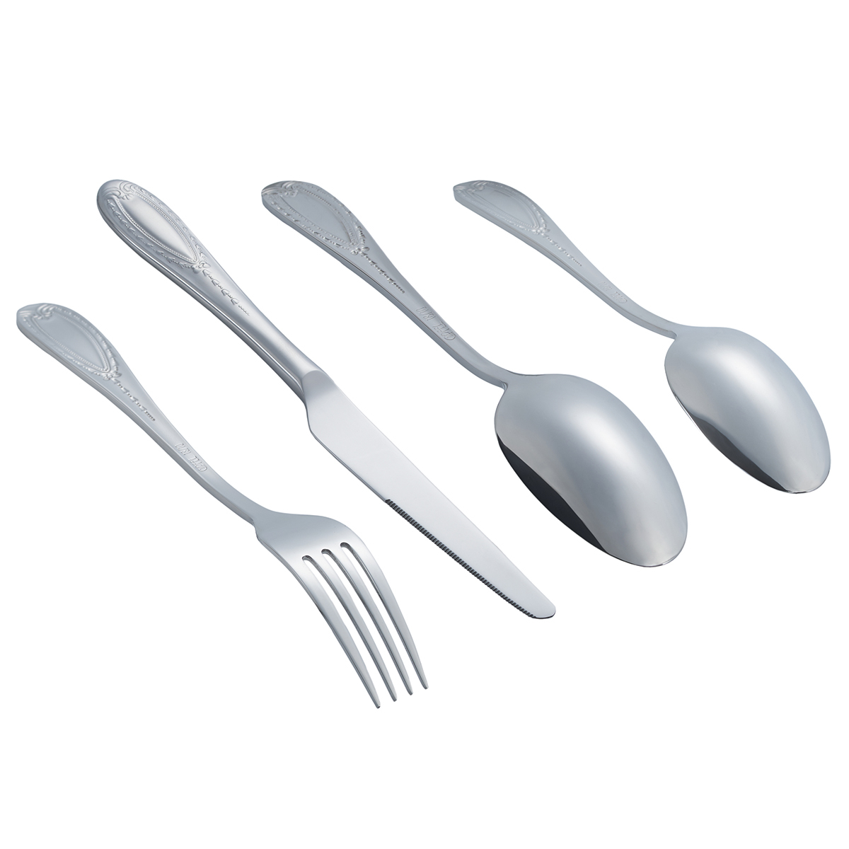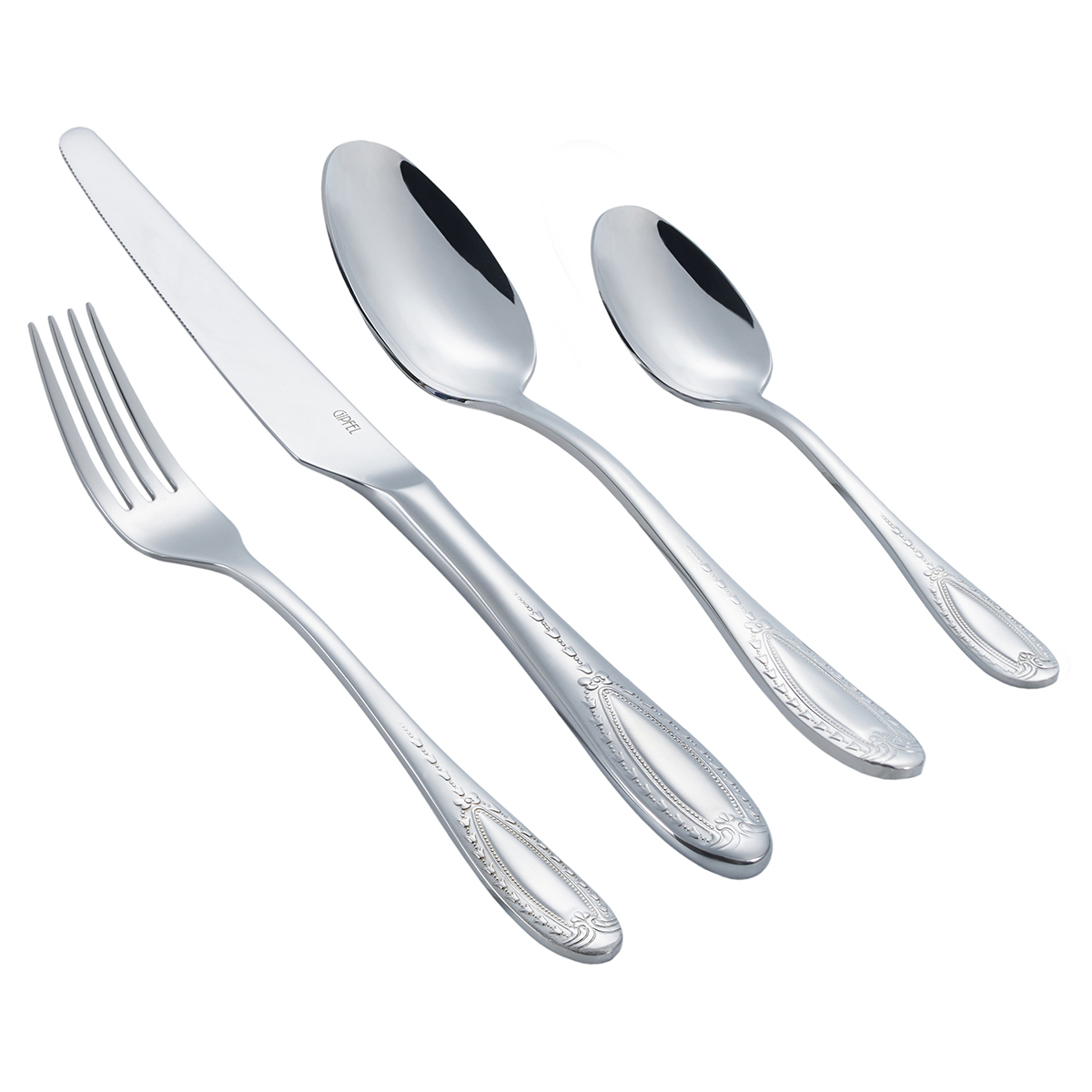 В состав наборов входят: столовый нож (6 шт.) – 23 см, столовая вилка (6 шт.) – 20 см, столовая ложка (6 шт.) – 20 см, чайная ложка (6 шт.) – 16 см.