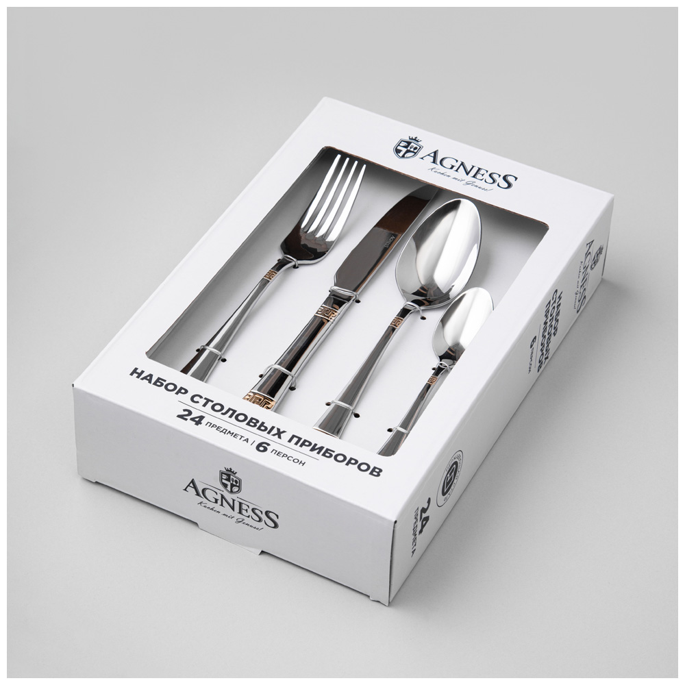 Набор столовых приборов AGNESS не только прекрасно выглядят, но и обладают отличной функциональностью. Вилки и ложки имеют комфортные ручки, которые удобно держать в руке. Каждый предмет выполнен из нержавеющей стали , что обеспечивает долговечность и устойчивость к коррозии. Набор столовых приборов является отличным выбором для кухни, где они могут быть использованы в повседневной жизни или во время особых событий и праздников. Они также подходят для ресторанов и кафе, добавляя шарма и элегантности к сервировке стола. Благодаря своей прочности и изысканному дизайну, этот набор столовых приборов станет вашим надежным и стильным спутником на многие годы.Чтобы приборы прослужили долго необходимо соблюдать ряд правил по уходу: использовать мягкие материалы, щадящие моющие эко вещества, замачивать застарелые пятна, исключая механическое воздействие. Запрещается использовать абразивные и хлоросодержащие средства.