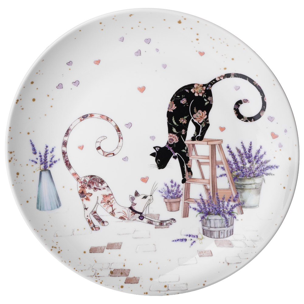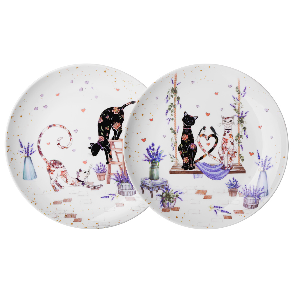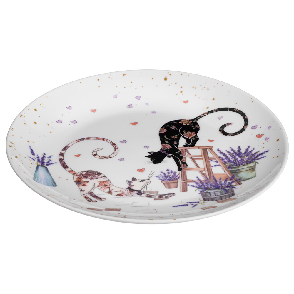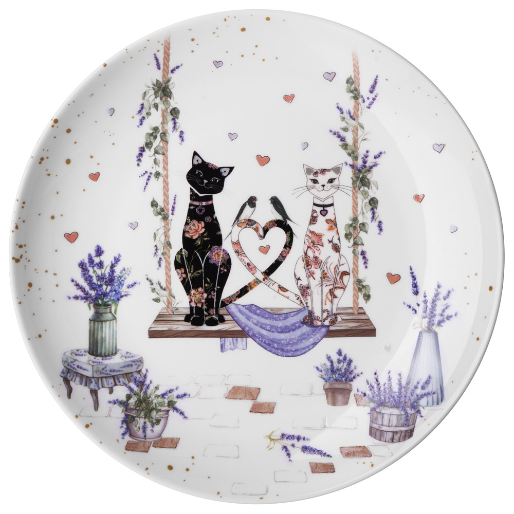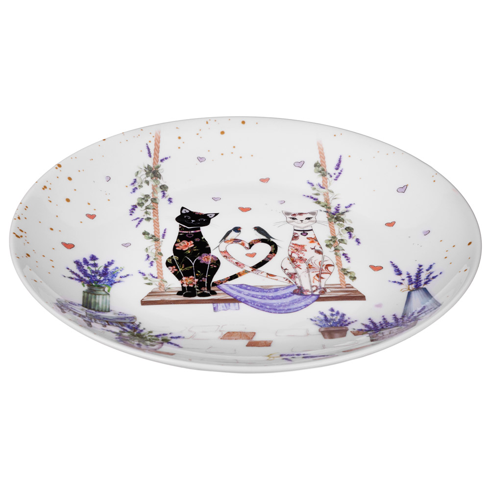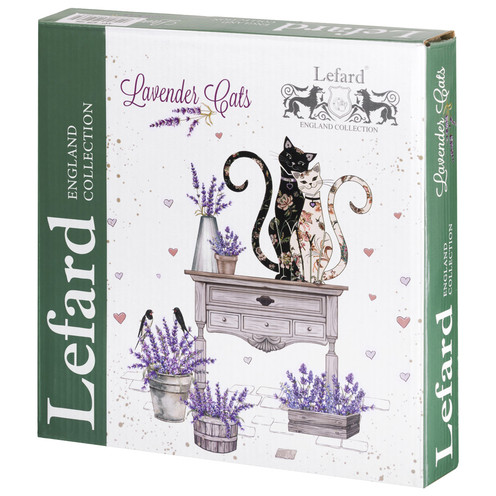 ТM Lefard эксклюзивная посуда серии «Лавандовые коты» создаст атмосферу уюта и поднимет настроение всем и каждому. Предметы украшены трогательными рисунками: влюблённые коты в окружении нежных соцветий лаванды. Упрочненный фарфор, рельефная деколь, блестящая глазурь. Коллекция представлена наборами обеденных, закусочных тарелок, салатниками оптимальных объемов, набором посуды, чайными парами и кружками. Легко сервировать любой стол на завтрак, обед или семейный ужин. Посуда хороша для ежедневного использования. Прекрасный подарок маме, бабушке, сестре, подруге. Красочная фирменная упаковка. Вся продукция сертифицирована и безопасна для контакта с пищевыми продуктами. Легка в уходе, не боится мытья в посудомоечной машине, использования в микроволновой печи.